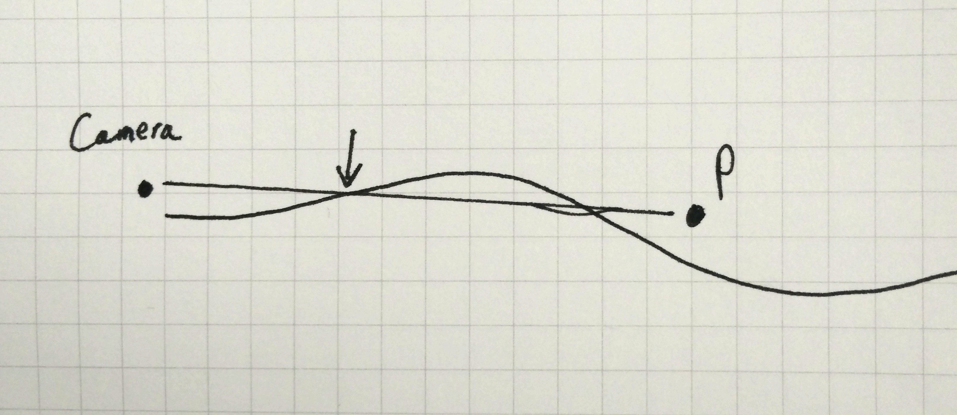 Come to think of it, I expect there might be an analytical solution to determining whether any given point should be occluded by the road. Maybe that would be better! We just need to find out whether the straight line passing through the camera and P intersects the road at any point between the camera and P: if it does then P is occluded by the road.