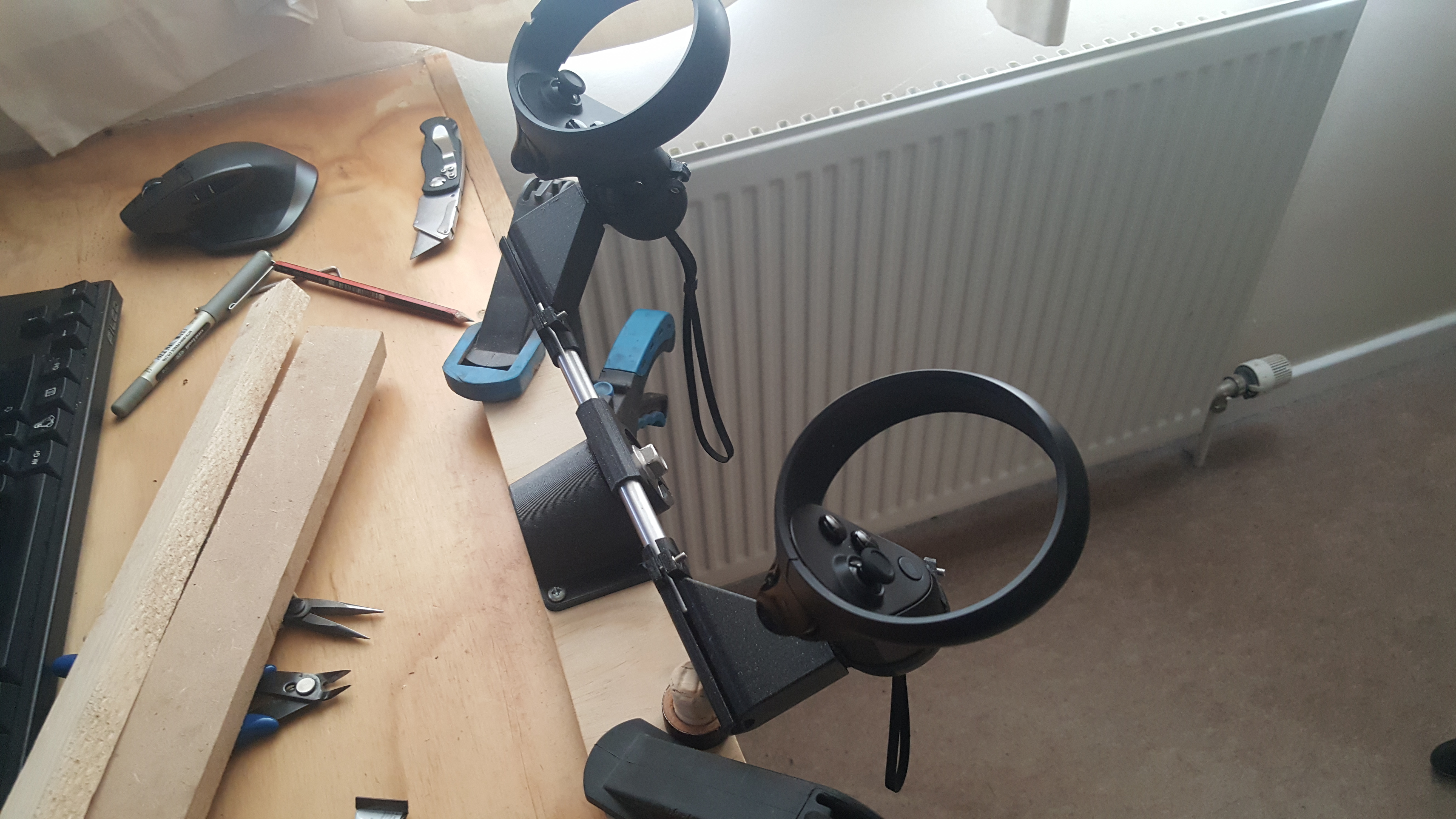 I have made a first attempt at a steering wheel for Oculus Quest controllers. Although this one doesn't work very well, I don't think it has completely disproven the concept. The controllers are held onto the rotating part with magnets, so that the controllers can be easily removed from the steering wheel to operate the Oculus Quest menus.