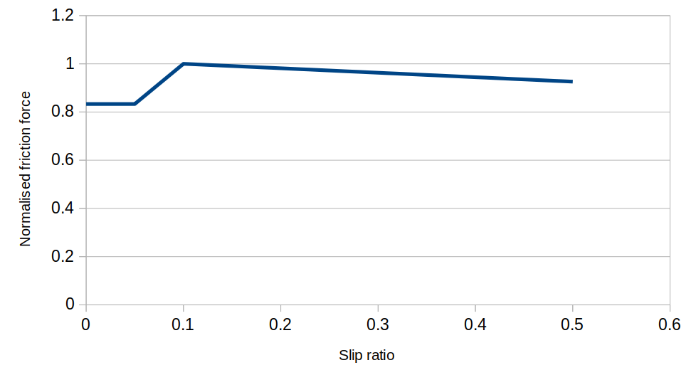 In reality the curve should be very much dependent on the tyre temperature, tyre pressure, tyre wear, road surface type, weather conditions, etc., but I just have a single hard-coded approximation made of linear sections that looks like this: