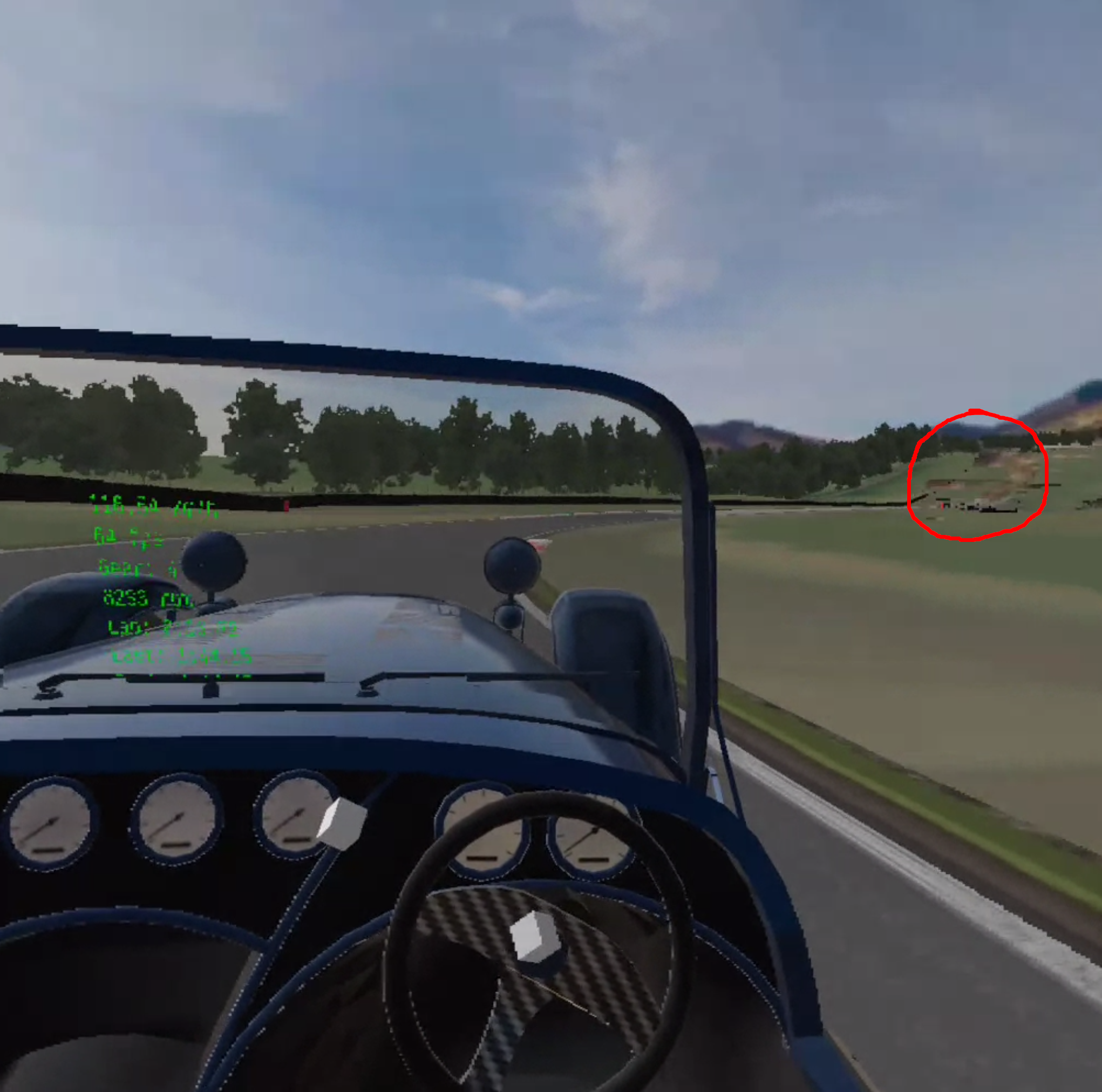 It would probably be worth spending a bit more of the polygon budget on the cockpit of the car, given that it takes up about a quarter of the field-of-view and is visible the entire time. Also a more appropriate (and higher-res) skybox would help, because Cadwell Park is actually not nestled in the foothills of the Rocky Mountains.
