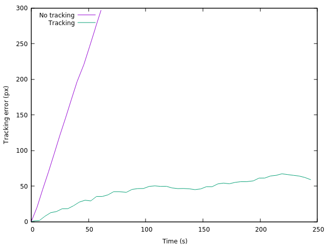 We can see that the "no tracking" case slides away quite quickly, while the "tracking" case slowly drifts away.