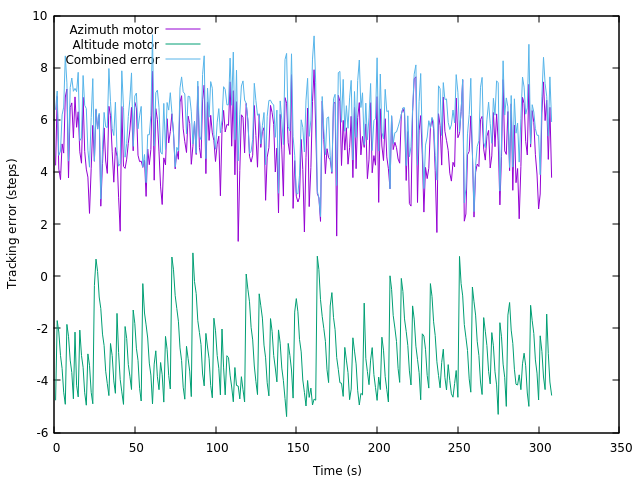 I didn't have any data for the tracking error from the motors, so I set the telescope up on my desk in the daytime and configured it to track the Orion nebula for 5 minutes in order to gather data on how far away the actual motor positions are from the targeted positions.
