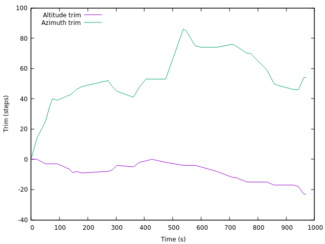 We can see that the auto-guider has adjusted the altitude motor down over time, relative to where it would be from tracking alone, and it has adjusted the azimuth motor towards the right over time, relative to where it would be from tracking alone. That probably means the telescope was out of level, with the top leaning towards the left. The azimuth motor ended up trimmed by more than 50 steps away from where it started, which would manifest as a difference of about 140 pixels on the x axis of the image (at 500x375).