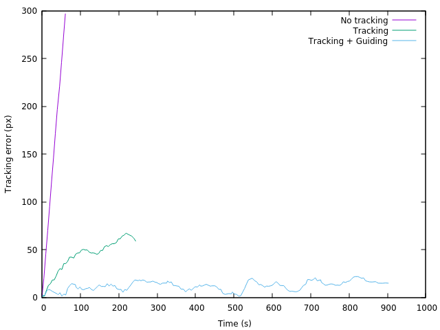 Also note that the error for the "NoTracking" and "Tracking" cases would presumably increase over time, and that the "Tracking+Guiding" data is based on a much longer timelapse. So probably this error distribution is understating how much of an improvement the auto-guider is.