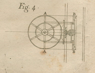 In common Watches in general the Wheels have about One-thrid the Dominion over the Balance that the Balance-spring has; that is, if the Power the Balance-spring has over the Balance be called Three, that from the Wheels is One; but in this my Time-keeper, the Wheels have only about One-eightieth Part of the Power over the Balance that the Balance-spring has; and it must be allowed, the less the Wheels have to do with the Balance, the better. The Wheels in a common Watch having this great Dominion over the Balance, they can, when the Watch is wound up, and the Balance at rest, set the Watch a-going; but when my Time-keeper's Balance is at rest, and the Spring is wound up, the Force of the Wheels can no more set it a-going, than the Force of the Wheels of a common Regulator can, when the Weight is wound up, set the Pendulum a-vibrating; nor will the Force from the Wheels move the Balance, when at rest, to a greater Angle in Proportion to the Vibration that it is to fetch, than the Force of the Wheels of a common Regulator can move the Pendulum from the Perpendicular, when it is at rest.
