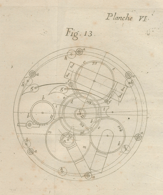 In this Time-keeper there is the greatest Care taken to avoid Friction as much as can be, by the Wheels moving on small Pivots, and in Ruby-holes, and high Numbers in the Wheels and Pinions.