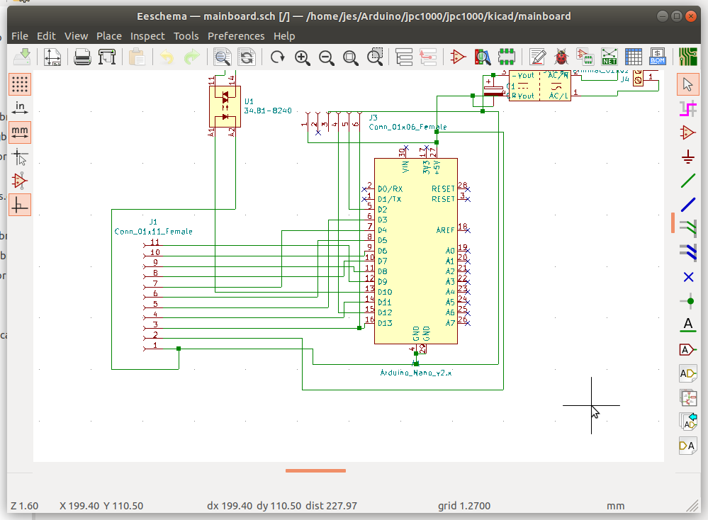 Normally at this point I would build the project up on prototyping board and then call it done, but this time I wanted to be a bit more professional, so I designed some PCBs using KiCad. The user interface is quite hard to understand at first, I recommend the Getting To Blinky playlist on the Contextual Electronics YouTube channel, although note that some of the key bindings seem to have changed between KiCad 4 and 5, so you'll have to figure that out on your own.