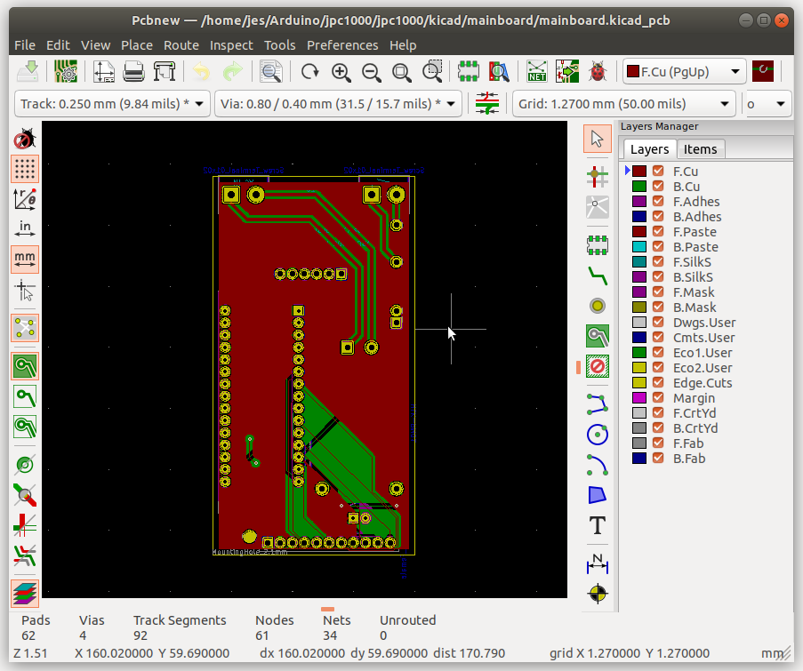 and then you draw the actual PCB layout using "Pcbnew", while KiCad automatically makes sure that you don't connect things that shouldn't be connected, and you do connect things that should be connected: