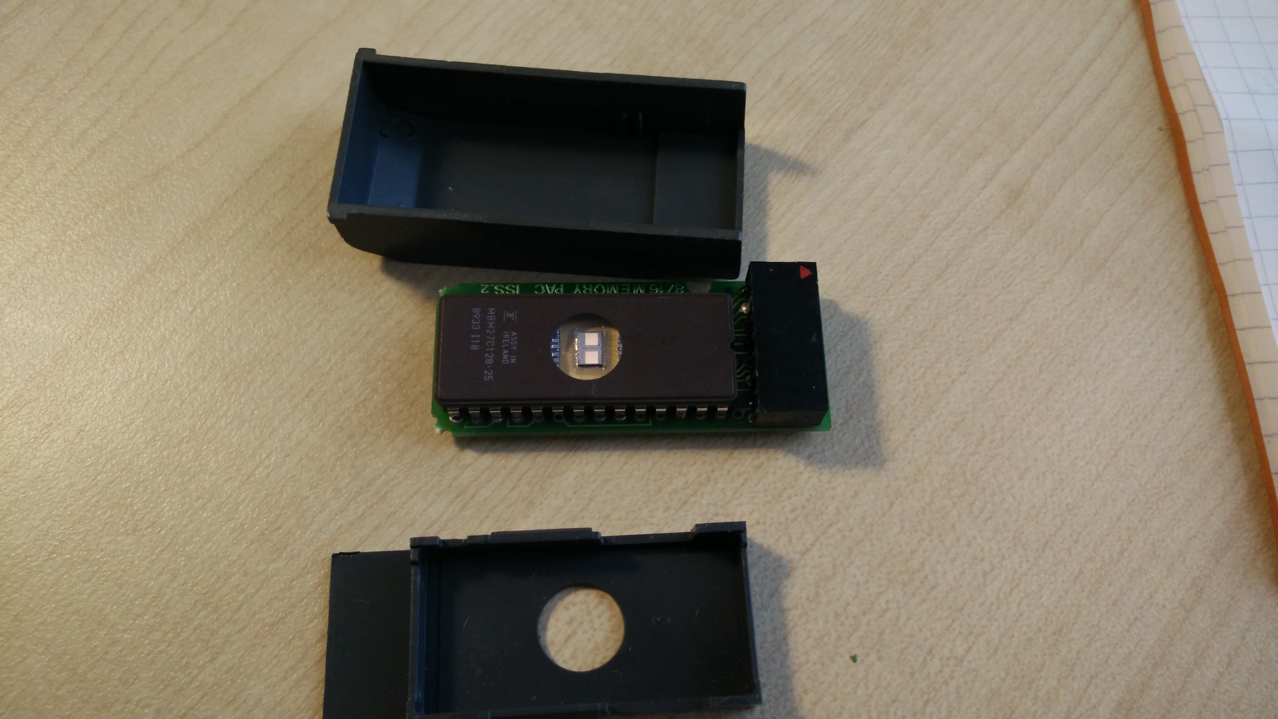 The Psion actually has 3 slots that peripherals can be plugged into. The first 2 are on the bottom of the device and are used to insert "datapaks". These are UV-erasable EPROMs which can be used to store code and data. The Psion has a weirdo "write-only" filesystem built on top of these EPROMs, which (I assume) "deletes" files by writing a bit to say that the file is no longer there, but can not reclaim used space. The only way to reclaim the space is to expose the little die window to UV light and erase the entire thing: