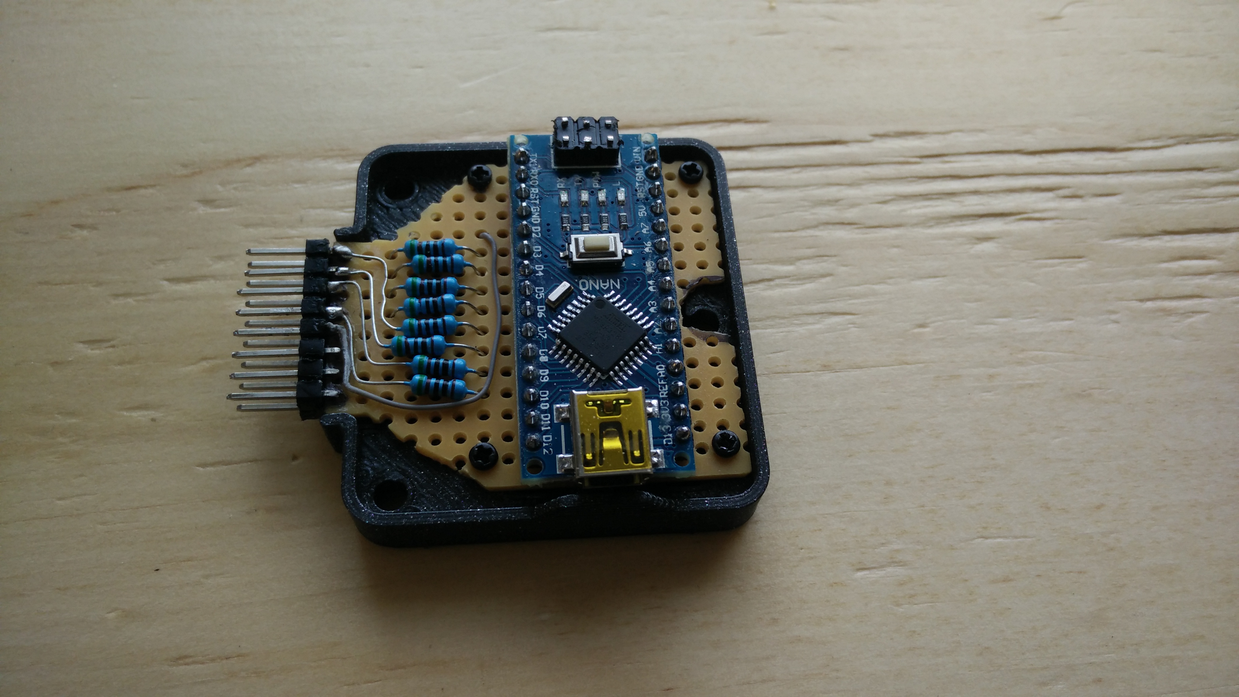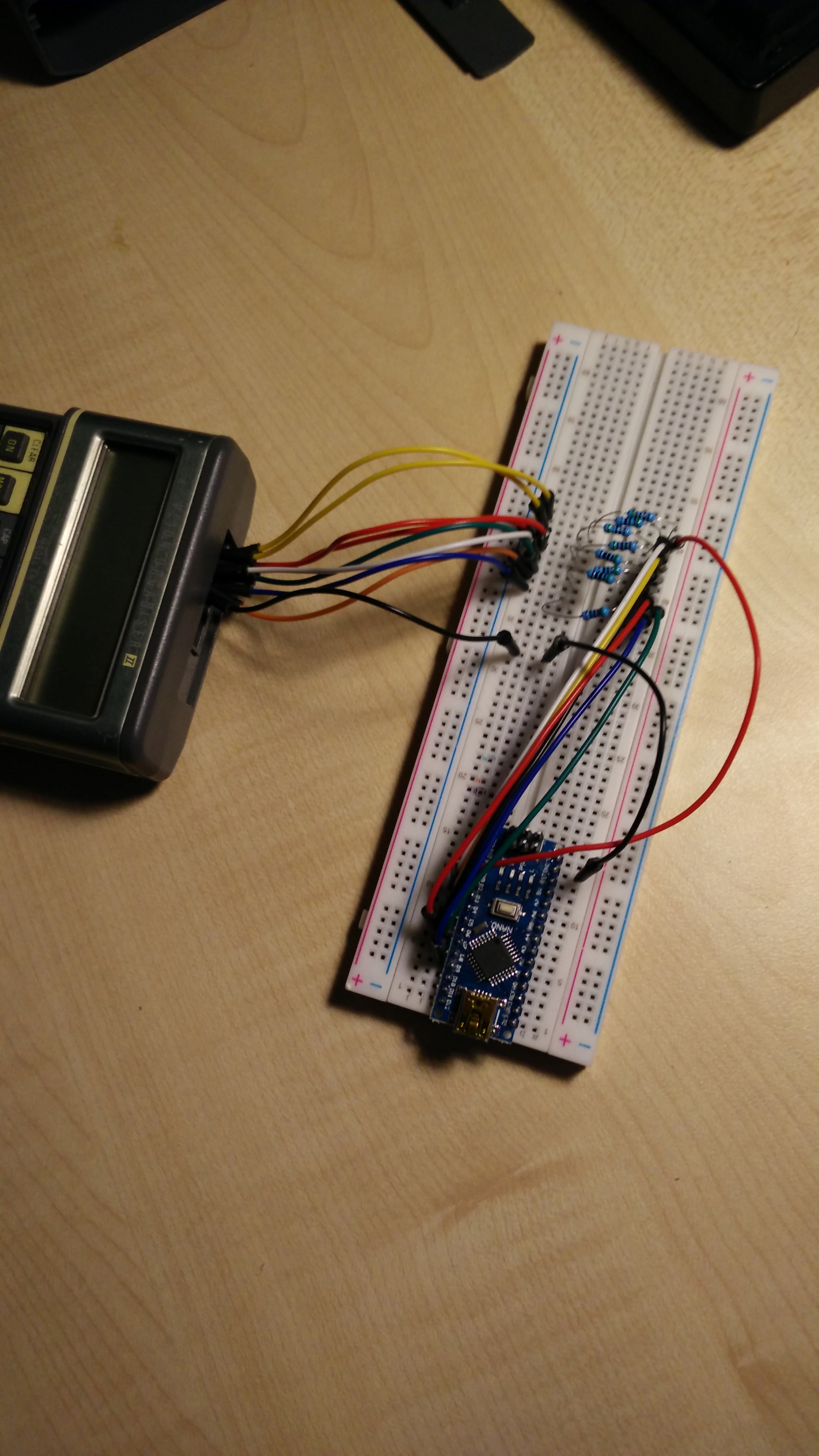 But since we know that the only other devices connected to the bus are the datapaks and the CPU, and we know that those things all respect the control signals properly, and we only need unidirectional communication, we can take a bit of a shortcut. I connected some digital outputs of the Arduino to the data pins via 510 ohm resistors (chosen mostly at random). This is low enough resistance to overcome the internal pullups on the data lines, but high enough that it doesn't interfere when the datapaks or CPU are trying to write to the bus. It's a really simple solution and seems to work well. So that's the hardware problem solved, the rest is just software.