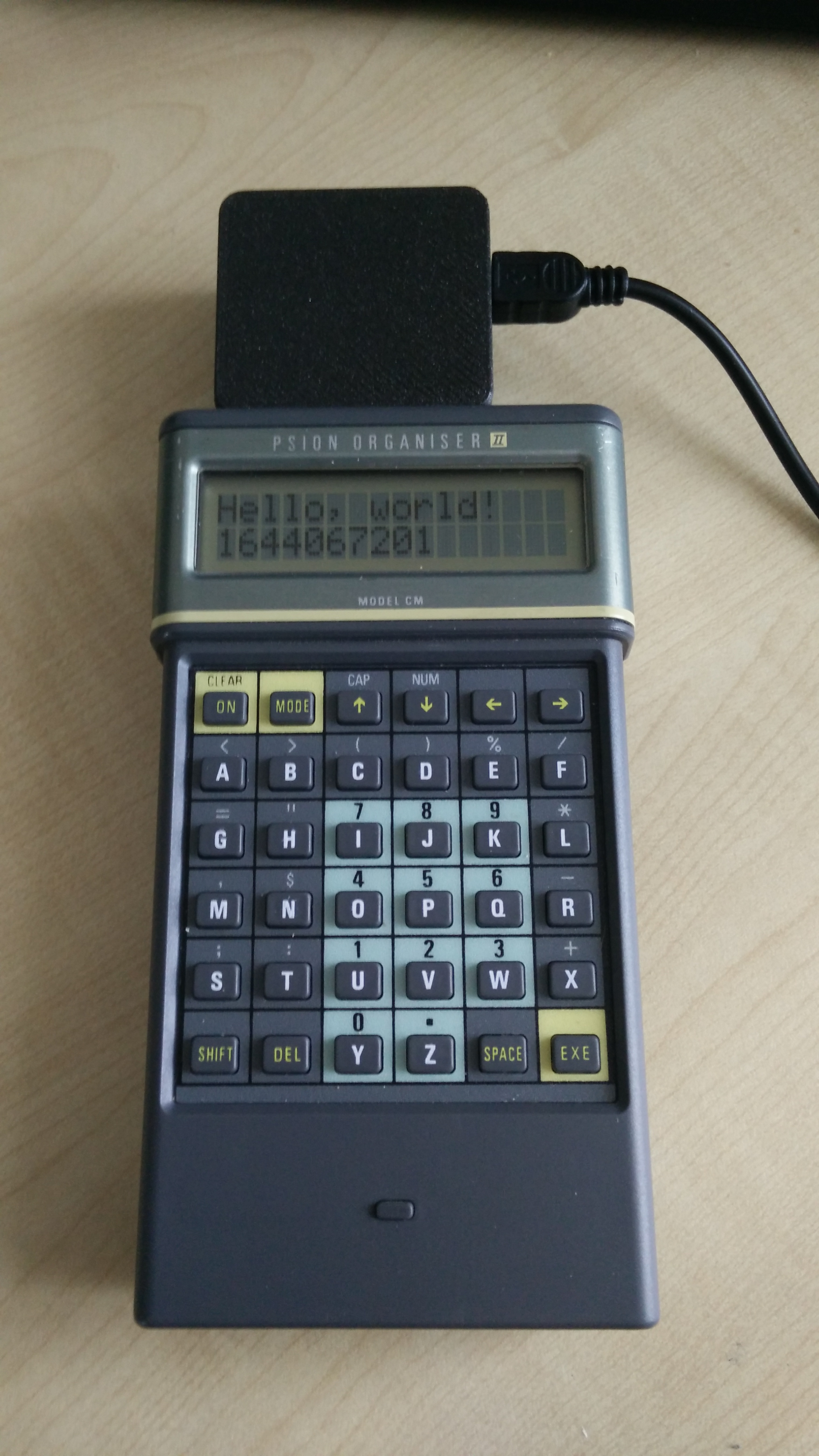 I built a hacky USB interface to the Psion Organiser II that lets you send messages to it over USB serial via an Arduino Nano. It involves the organiser executing machine code stored in a string in its BASIC-like language, and it totally abuses the CPU's bus design. But it's simple and it works.