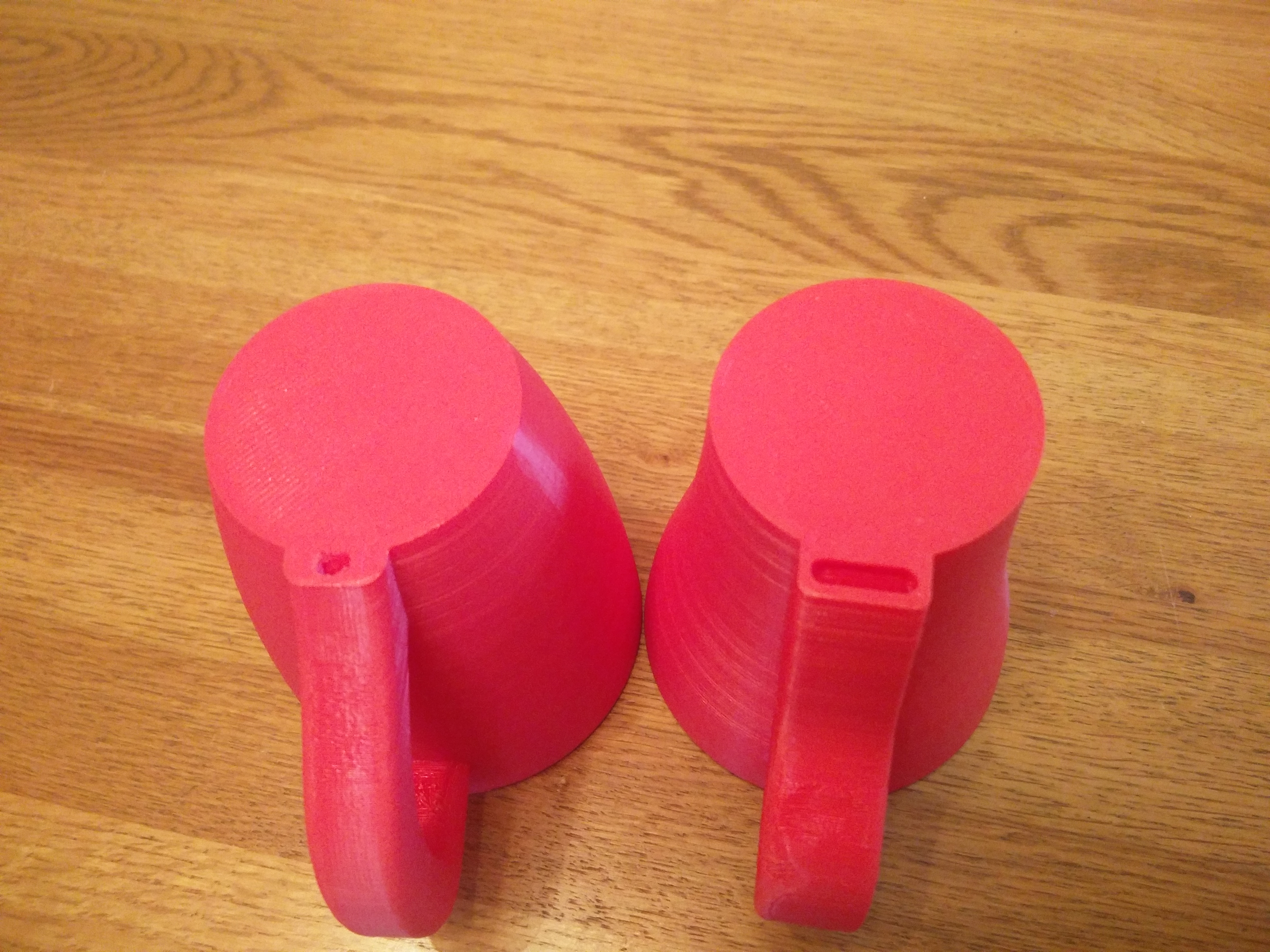 Testing the new mug in the sink, I was delighted to find that it drained much quicker than the first one. I repeated the measurement with the stopwatch and measuring jug, and found that the new mug drained 150ml in 12 seconds, for an average flow rate of 12.5 ml/sec. The average flow rate is 5.6x better and the time to drain is 7.5x better.