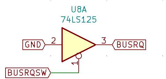 We need some logic to make sure that we only try to interact with the bus when we have asked for BUSRQ and have been given BUSAK. I called this signal "HAVEBUS". HAVEBUS is high when we have the bus. There is also "INVHAVEBUS" which is the inverse of HAVEBUS, useful for controlling active-low inputs. I used a 74LS02 quad NOR gate (there are 4 gates per chip) to generate HAVEBUS. HAVEBUS = BUSRQSW NOR BUSAK. NOR is basically AND for active-low inputs, via De Morgan's law.