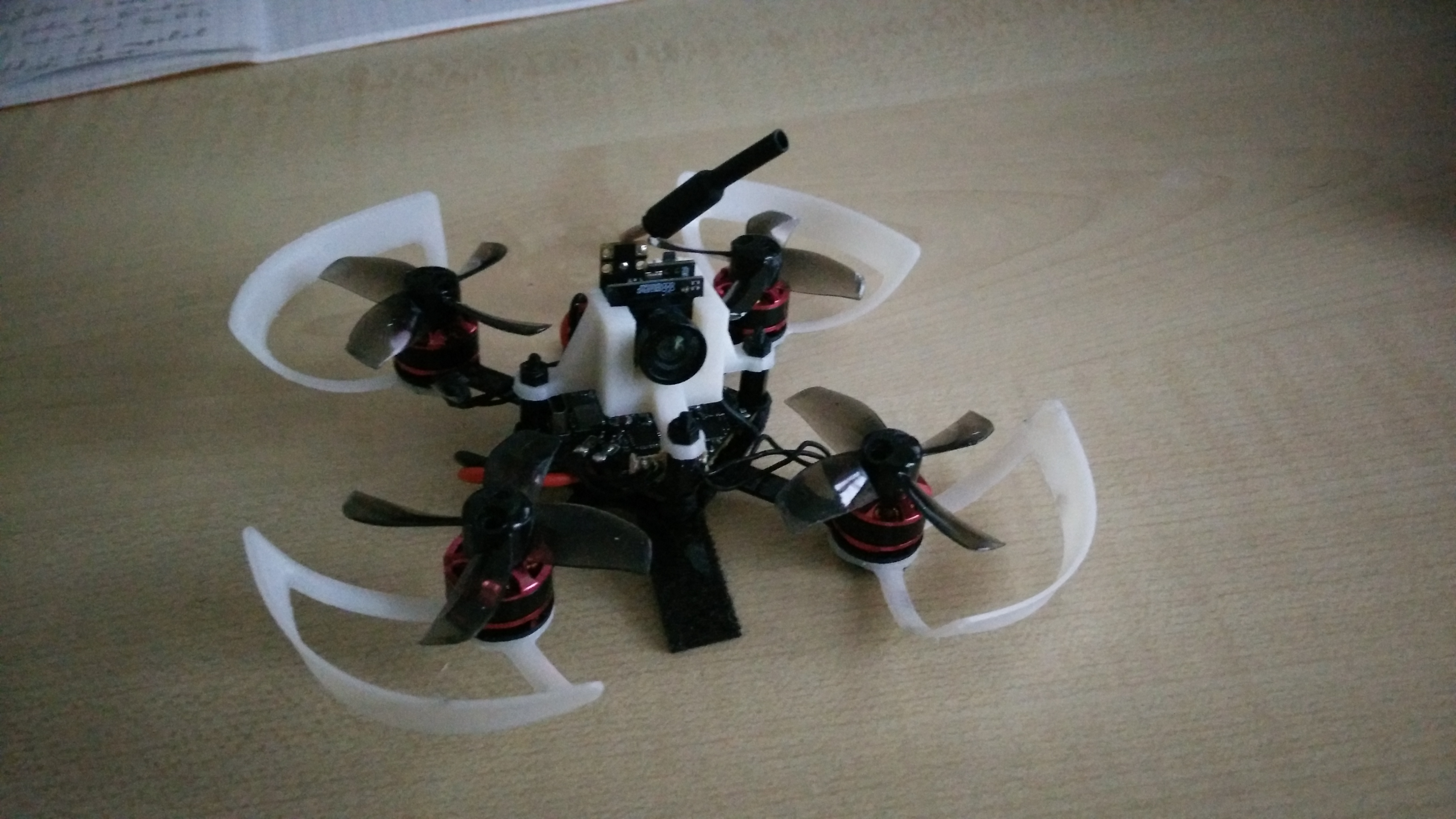 I recently built a small quadcopter and have been flying it around the house. Predictably, I have been crashing into the walls a lot. I wanted to put some rotor guards on to stop the propellers from scratching things, and I have come up with a 3d-printable rotor guard design that I think is quite elegant.