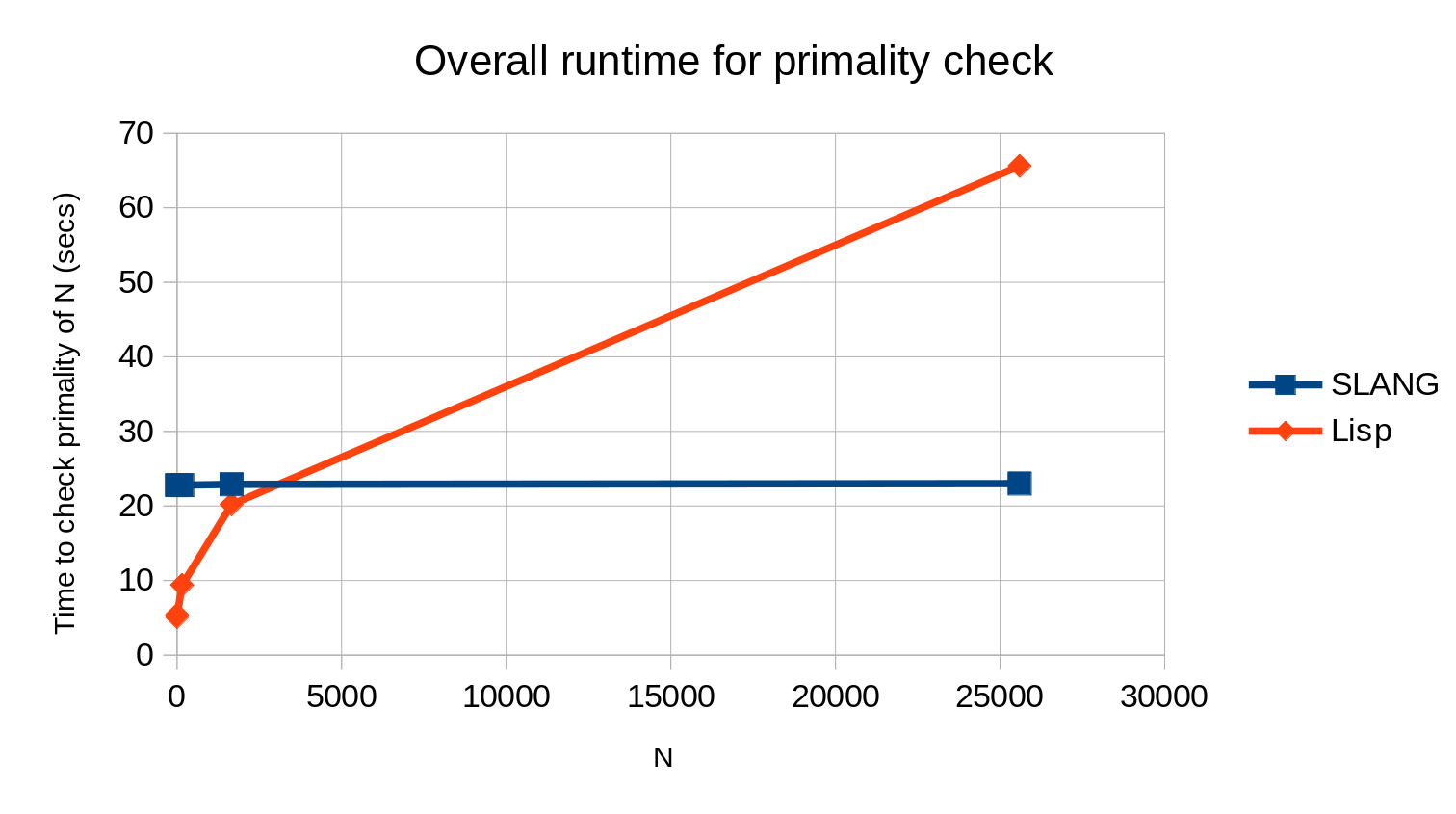 Here's a chart showing overall runtime for both the SLANG and the Lisp version, with the time for the SLANG version including the time it took to run the compiler, and the time in all cases being measured from hitting enter at the shell prompt to getting back at the shell prompt (i.e. including process switching overhead, which occurs twice if we need to run the compiler).