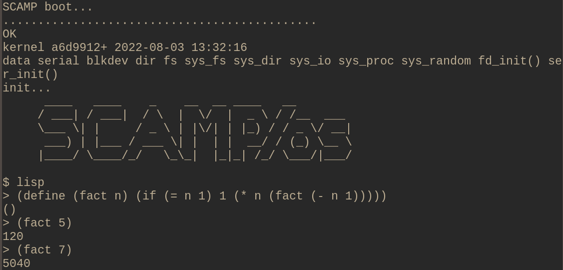 In practice we want to be able to store things other than cons cells (e.g. we want to represent integers without some complicated encoding made out of cons cells). For this reason I have established the convention that if the car field is nonzero, but less than 256, then it is a type identifier rather than a pointer to a cons cell. This is perfectly safe because the first 256 addresses in SCAMP memory are the bootloader ROM, so there can never be actual cons cells created at those addresses. Where the car field indicates that a cell has a non-cons-cell type, the cdr field is specific to that type. For integers it contains the raw integer. For strings it contains a pointer to the string, etc.