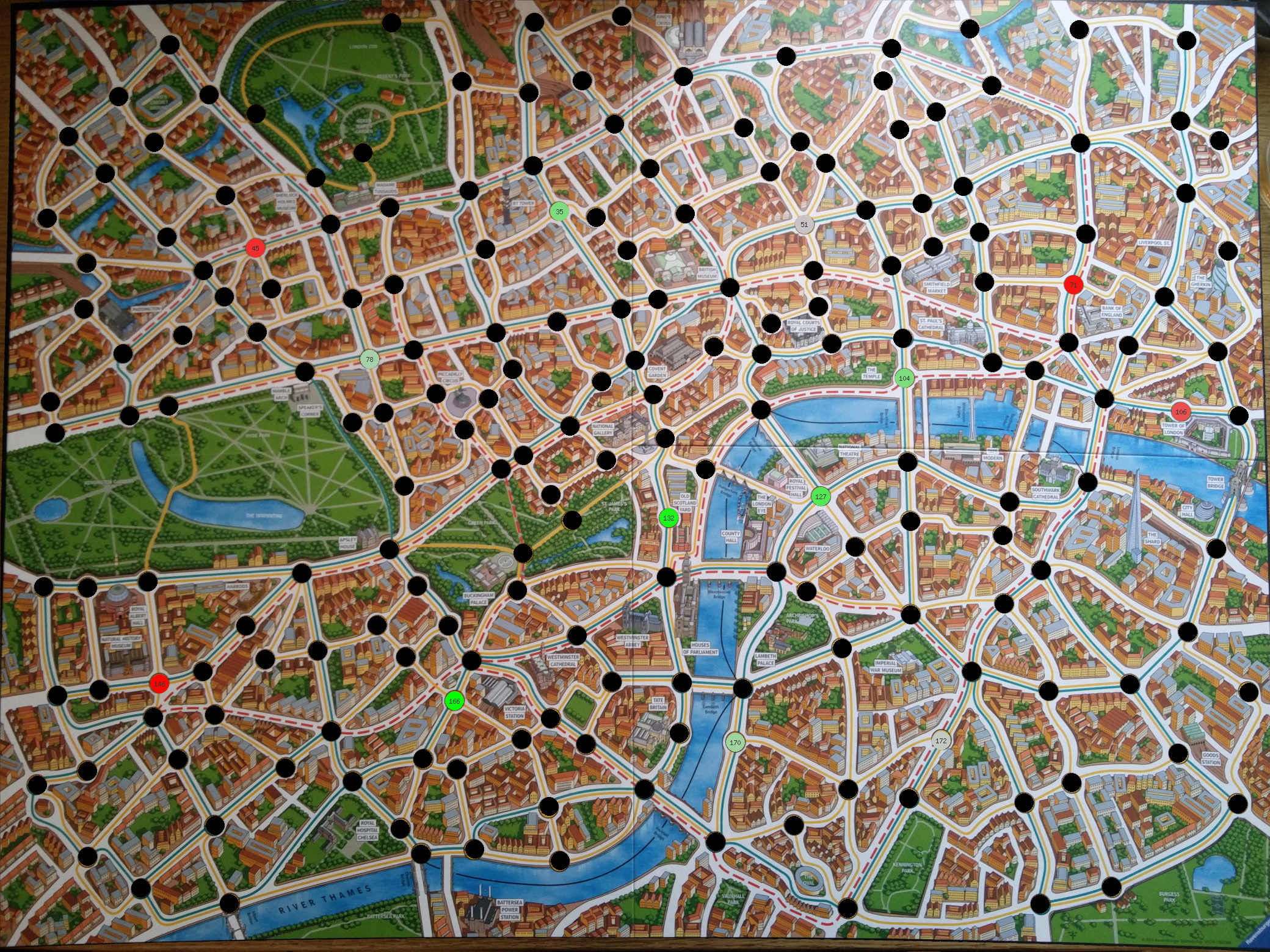 I also tried to generate an alternative set of 13 starting stations which would provide more balance, but I couldn't find 13 stations spread all across the board from which Mr. X had reasonably similar chances of winning: