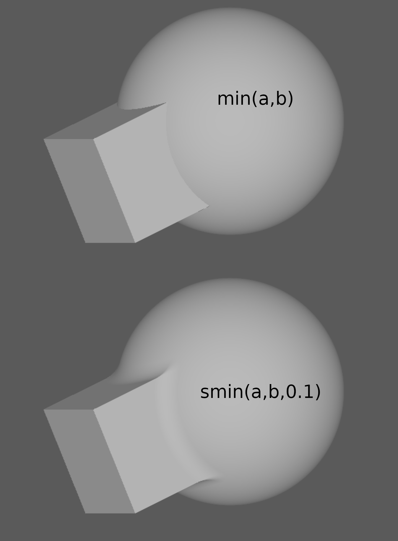 And then when SDFs start to get really cool is with operations like "smooth minimum", this is a family of functions that act like a boolean union, except with automatic smoothing of the join. An example is: