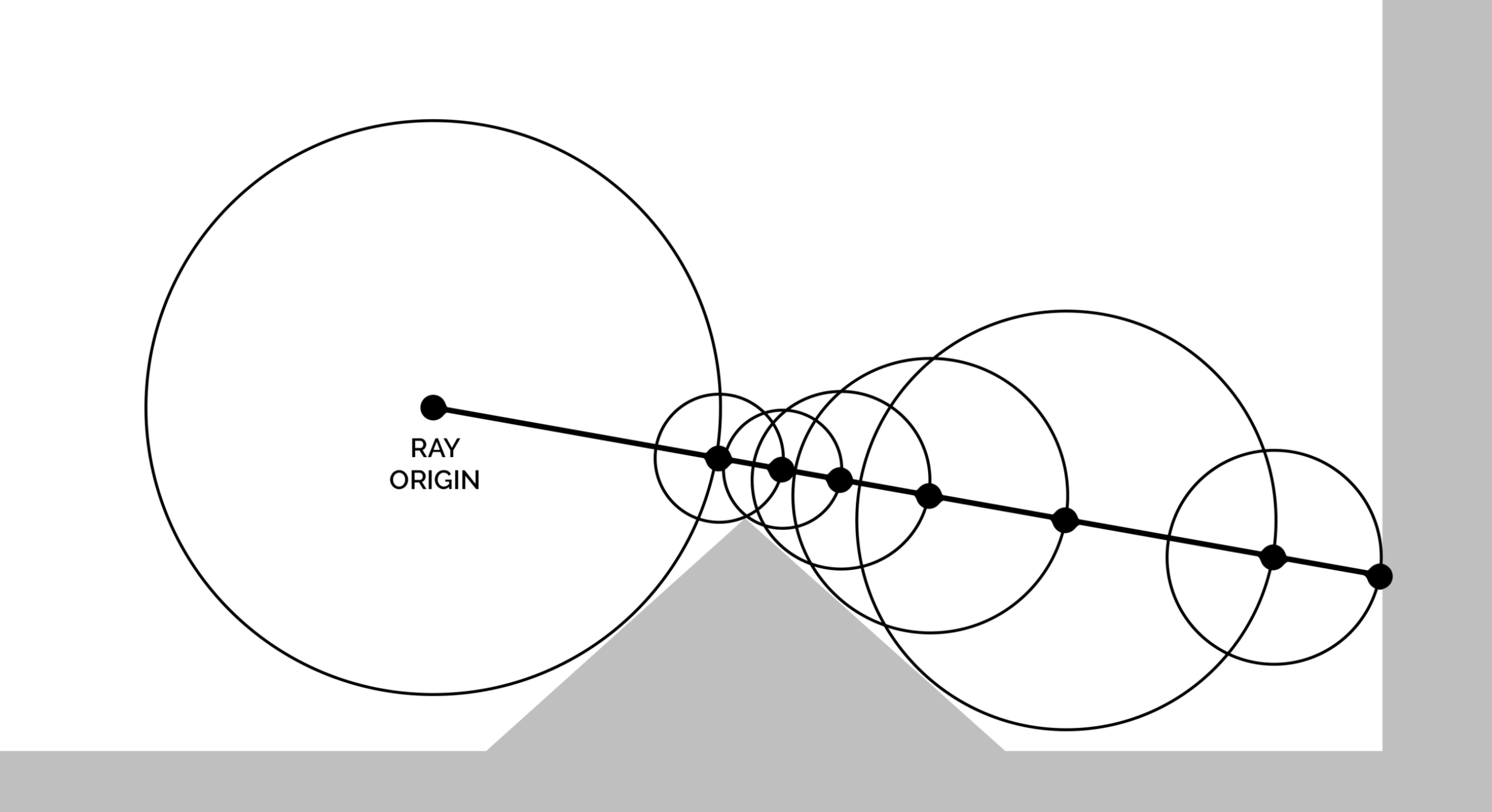 The circles represent the value returned by the SDF (distance to the closest point), and you can see the step size slows down as the ray gets close to the surface, and speeds up as it gets further away.