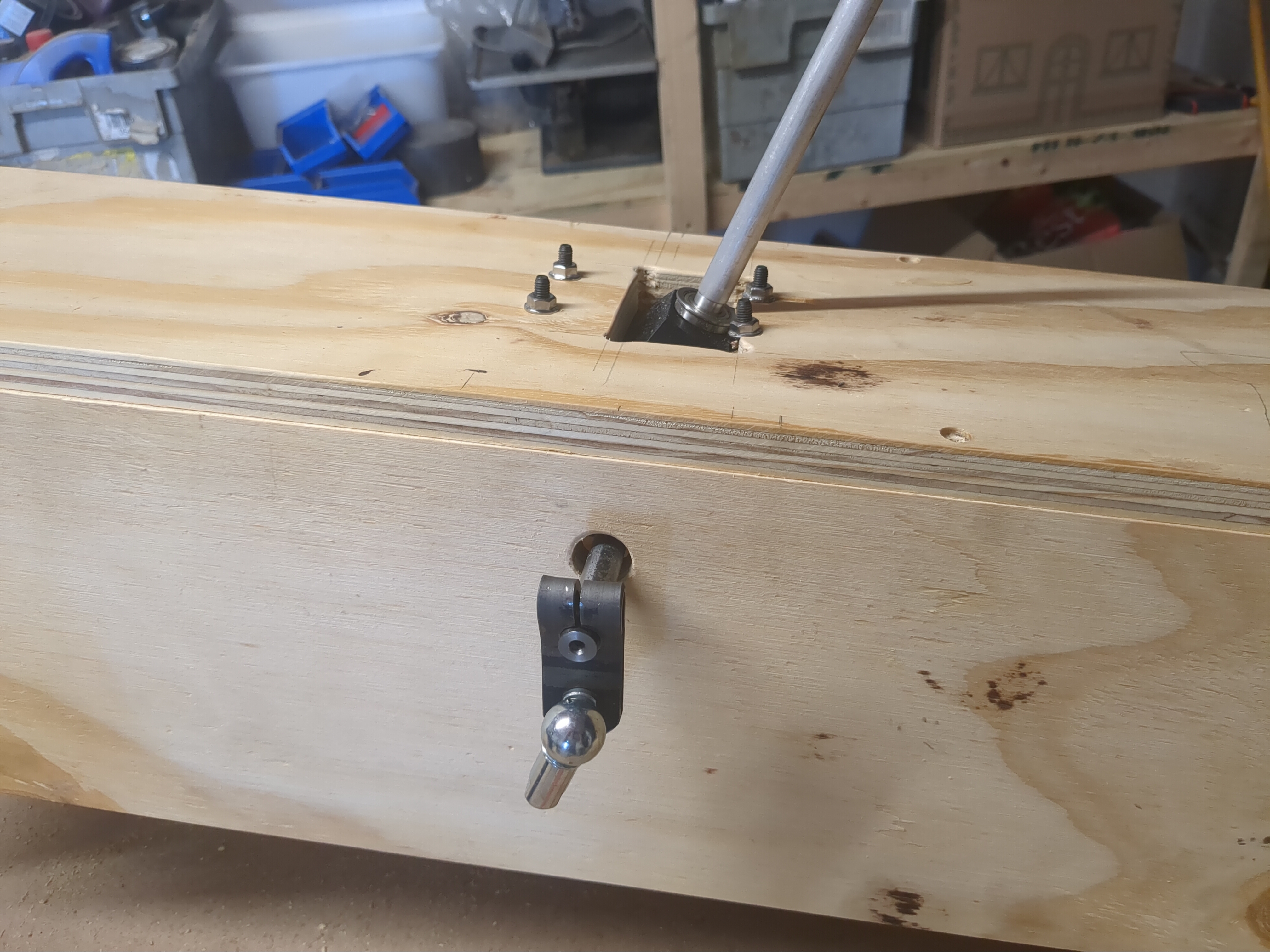 Like the gear lever, the shaft is not on any sort of bearing, it just pivots in holes drilled in the wood. I think this is also fine for the brake, because it doesn't get much use, although the force on the brake pedal is much higher than on the gear lever. If the pivots do get worn out then they can easily be drilled out and bushed.