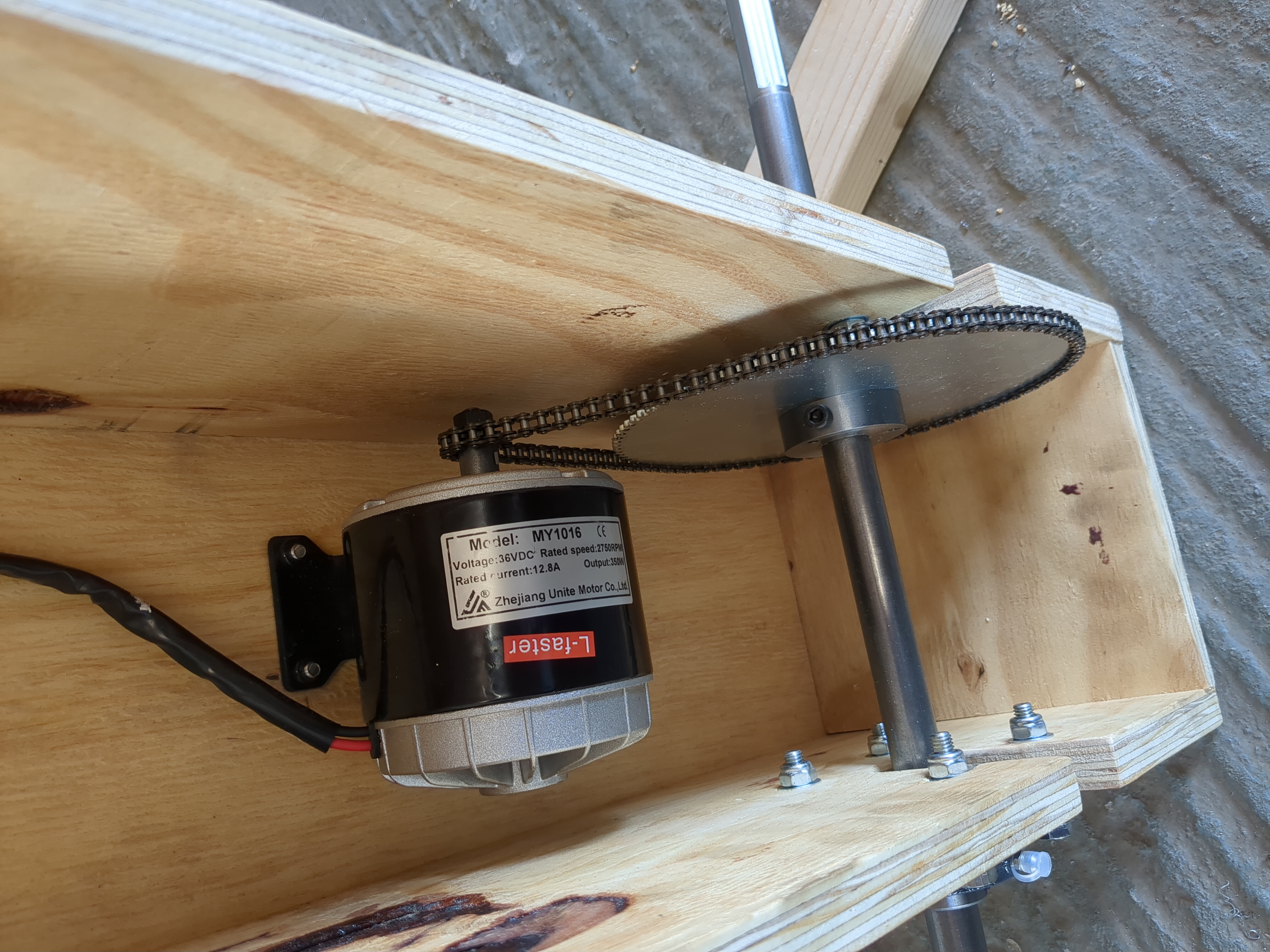The tractor is powered by a 350W brushed DC motor with a 36v Li-ion ebike battery. You may be thinking that 350 watts doesn't sound very powerful, and you're right. It is a toy for children to drive around the garden, being slow is a feature not a bug.