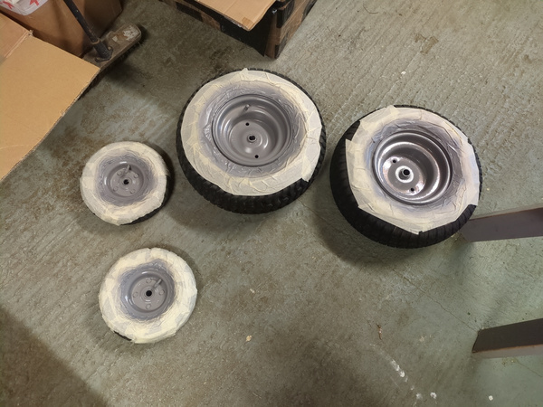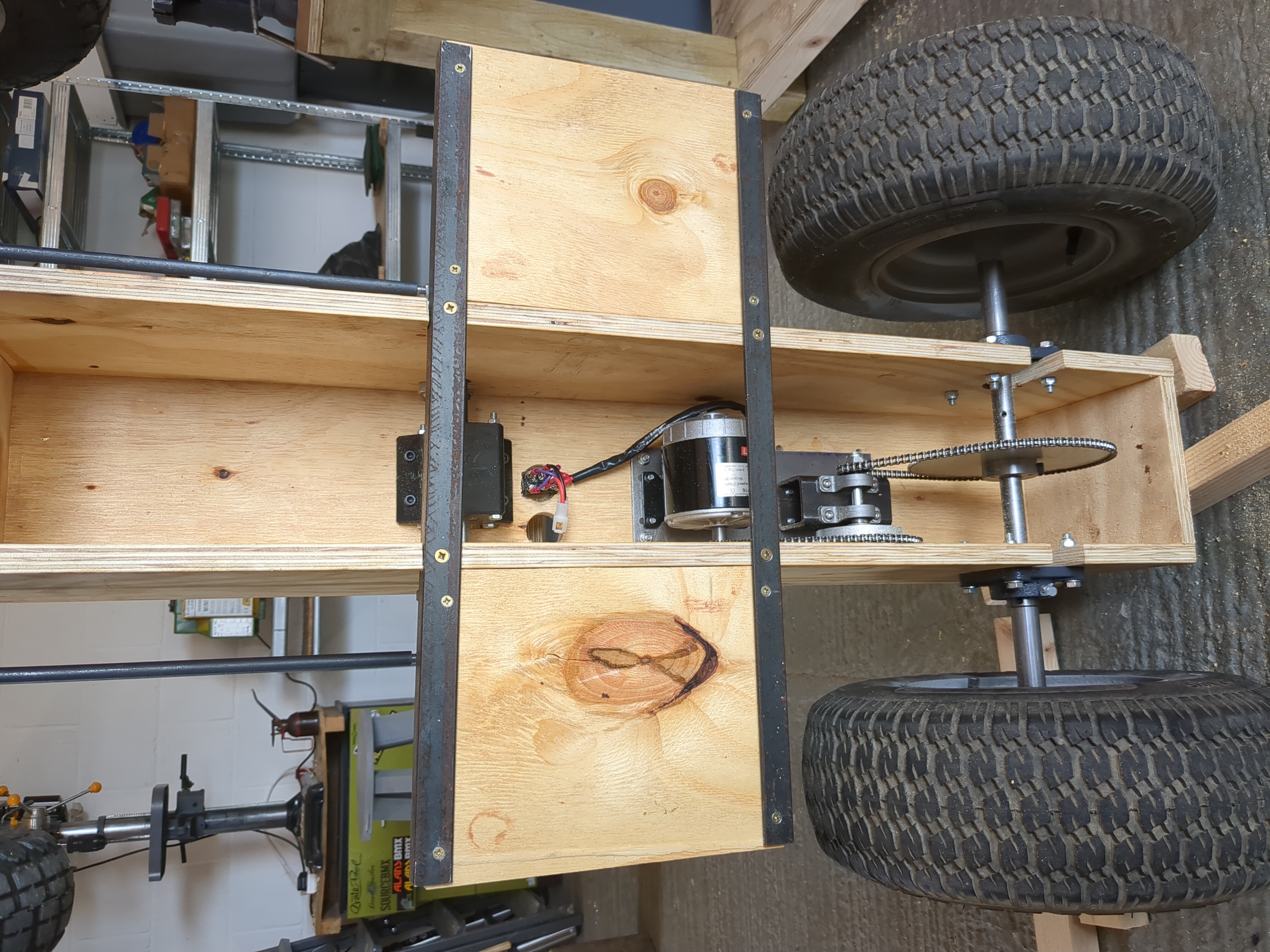 The rear wheels are ride-on lawnmower rear wheels. They fit a 19mm axle, which annoyingly is not a size that I was able to buy cheap pillow block bearings for. In hindsight, maybe they actually fit a 3/4" axle and it would have been easy? In any case, I don't want to deliberately construct objects with imperial measurements, that's just trouble for everyone.