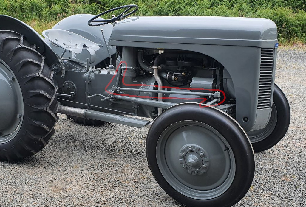 The TE20 steering wheel goes down to a gearbox quite near the driver, a shaft comes out each side, one turning clockwise and the other anticlockwise (as viewed from one fixed reference side), an arm off each shaft holds one end of a track rod, and the other end of the track rod is connected to an arm on the stub axle kingpin thing. Highlighted in red here: