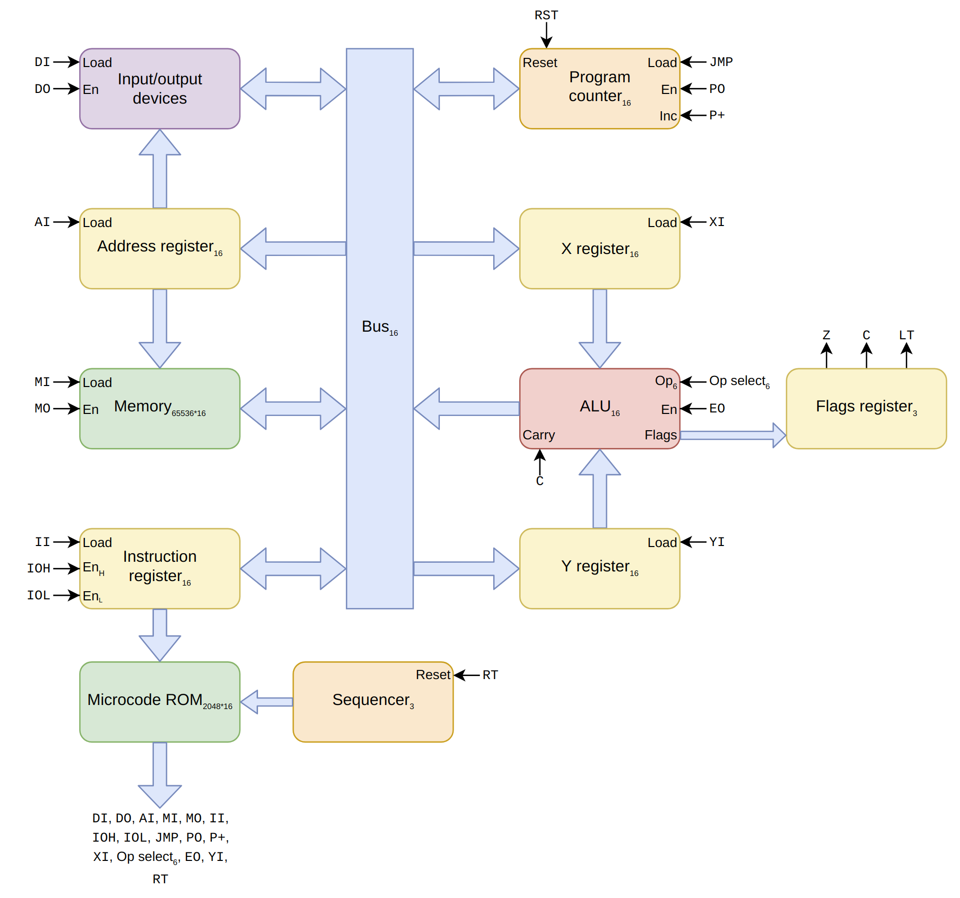 The principle differences are that I am using a 16-bit bus instead of 8-bit, and I am using 16-bit addresses instead of 4-bit. Again, while