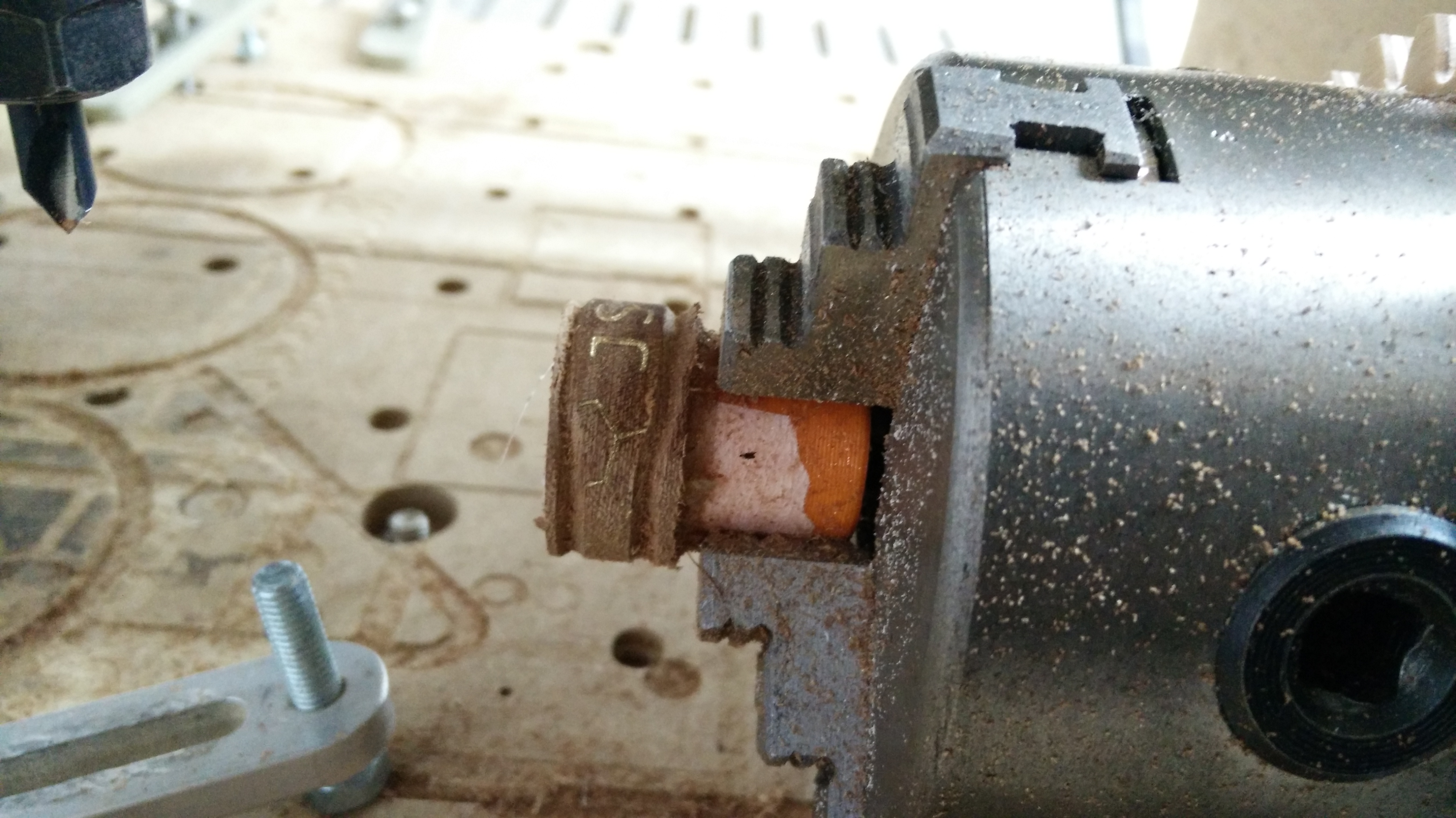 I made the wooden ring for myself, and put my initials on it. This was made by hot-gluing a "blank" (cut out with the CNC machine in its normal linear configuration) to a 3d-printed mandrel held in the chuck: