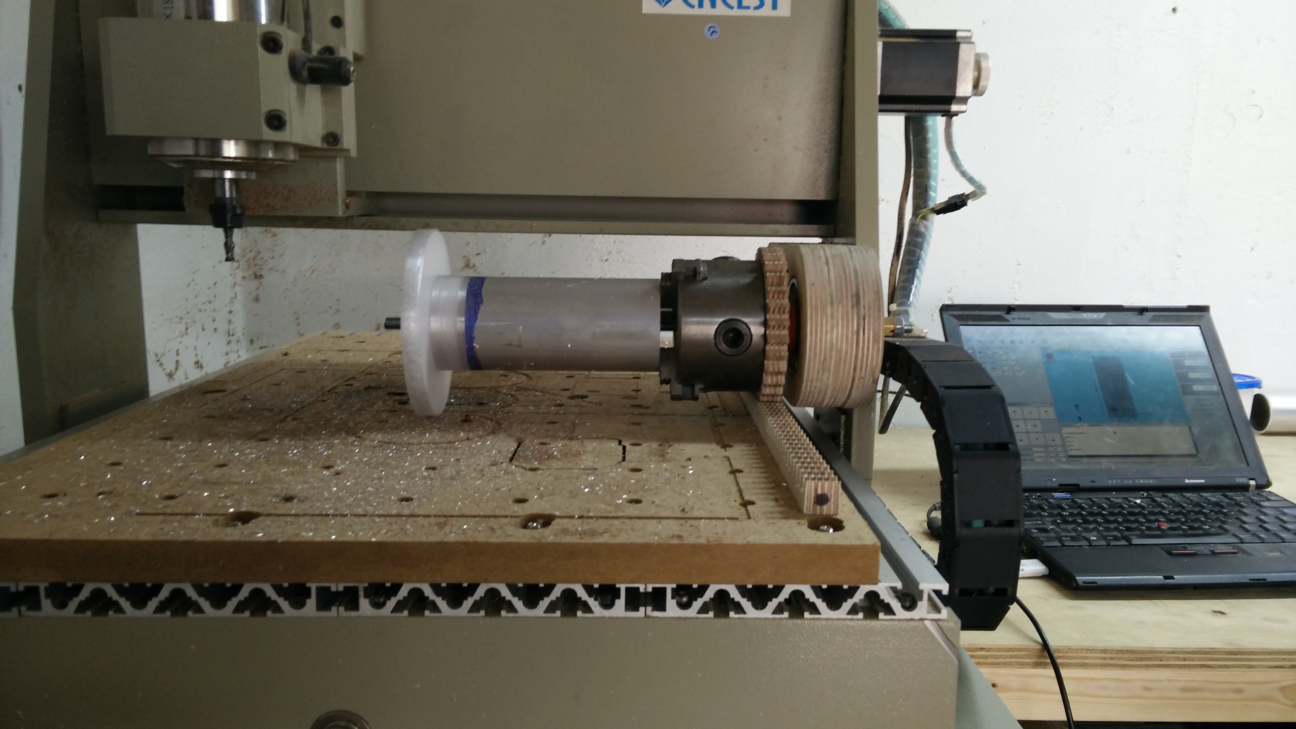 I've been playing with my weird rotary axis for a couple of weeks now. It's a rotary axis mounted on the gantry, with the rotation of the chuck geared off a toothed rack on the table. I've had a few questions about the practicalities of using it, so this is some of what I've learnt.