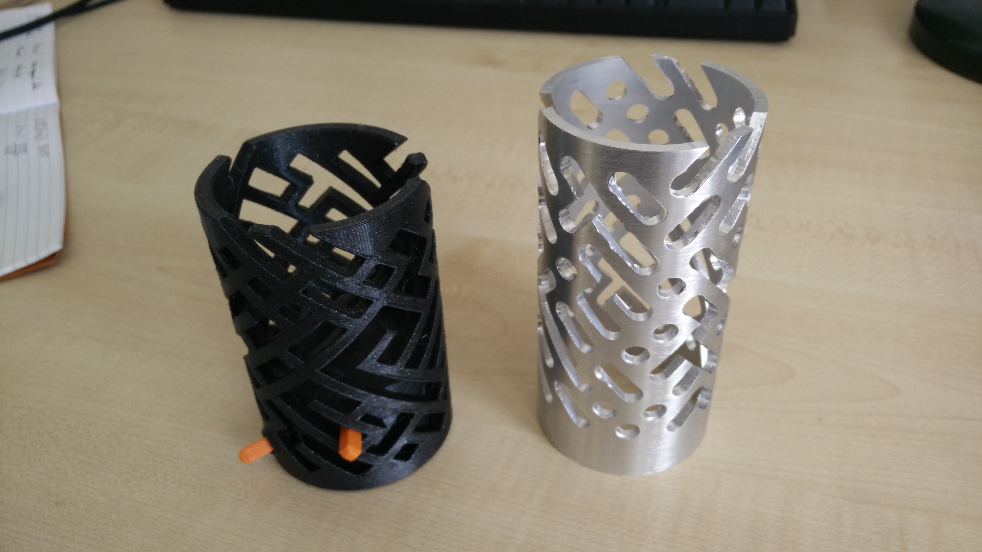 The one on the left is 3d printed and the one on the right is machined out of aluminium. The machining is not great, and the part is worse at the end that was further from the chuck, because my "tailstock" support wheel doesn't provide a lot of support, but it's a very promising start. I still need to make metal versions of the puck and the sliding rods.