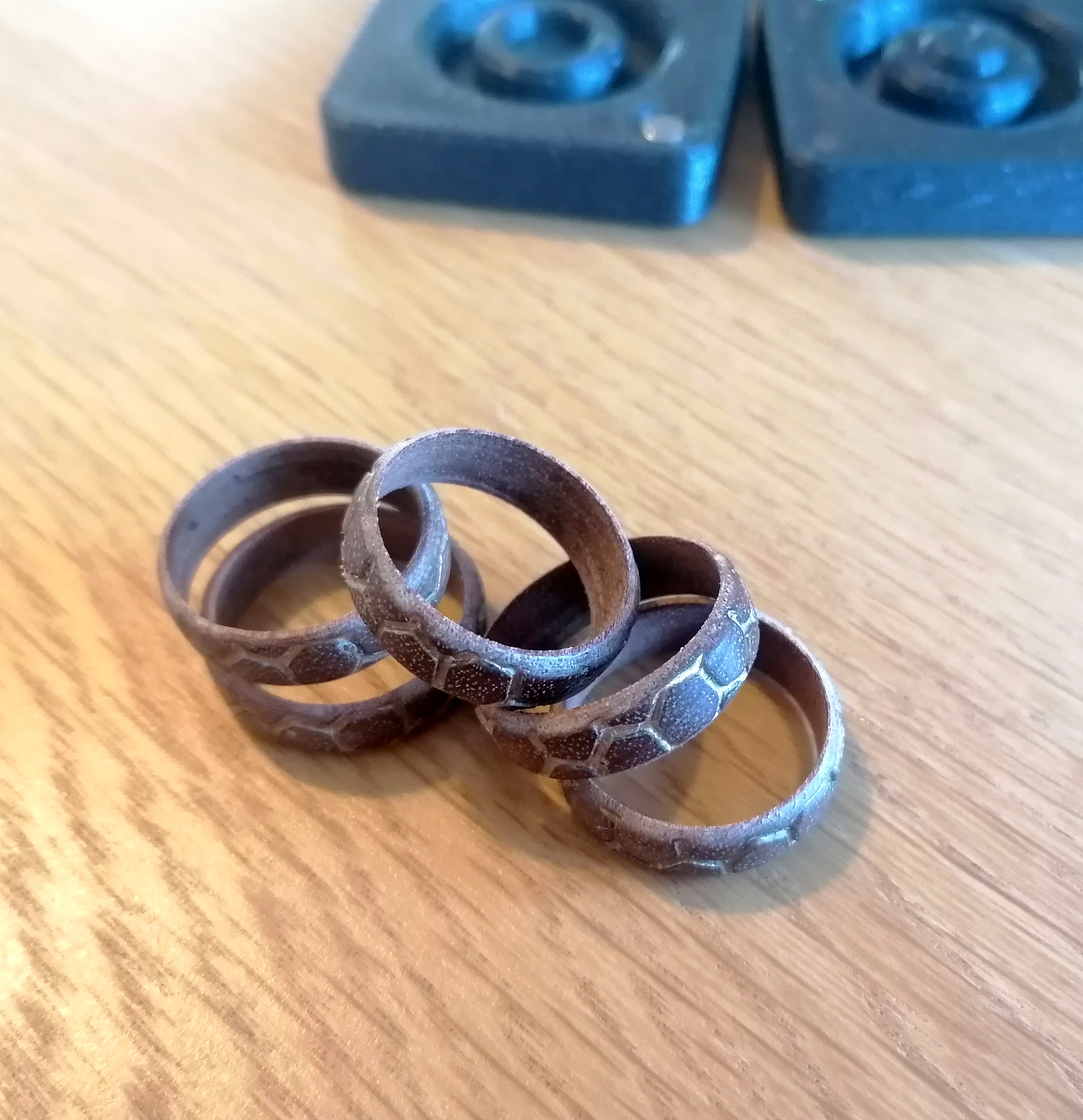 If I were to make more rings I would do them differently. I think these are weaker than they need to be because the grain runs across the ring in the long direction instead of the short direction. They should have the grain running along the direction of the finger, rather than perpendicular to the finger. Also, instead of making each of the ring blanks individually and then measuring their coordinate offsets and machining patterns on them individually, I would start with a single long tube of wood, with the grain running axially. I'd machine the pattern over the entire surface of the tube without regard for where each ring is going to start and finish, and then I'd part off individual rings from this large tube. I think this would be a lot less work.