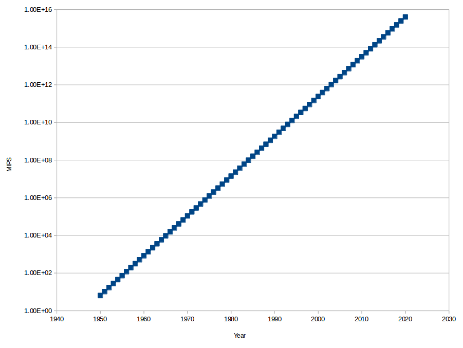 Let's try a quick sanity check. The first computer capable of at least 1 MIPS was the IBM 7030, first produced in 1961. Our exponential function places world computing power in 1961 at 834 MIPS. According to the History Learning Site, there were 250 computers in total in 1955, and 20,000 in 1965. This might put the number in 1961 at around 3,500 computers (again by exponential regression). If they averaged 0.23 MIPS (834 MIPS divided by 3,500 computers), then we're pretty close. That sounds believable. At a minimum, 834 MIPS is neither an unrealistic over- nor under-estimate.