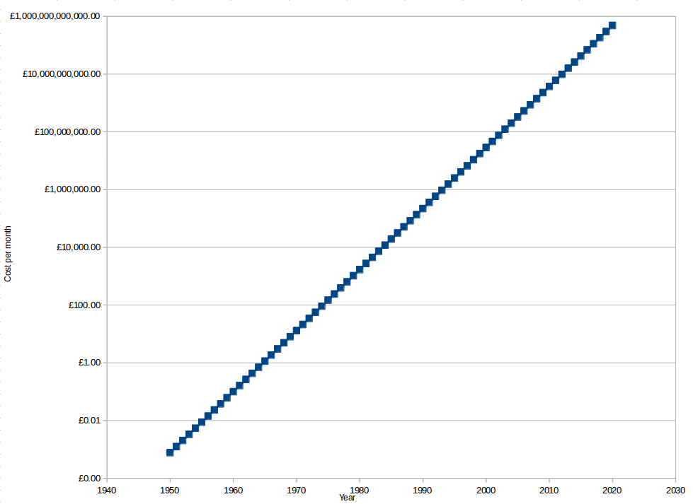 Renting historical computing power starts to sting, at £150/mo, if you want to rent all of the power that existed in 1975, and by 1979 you're spending over £1,000/mo.