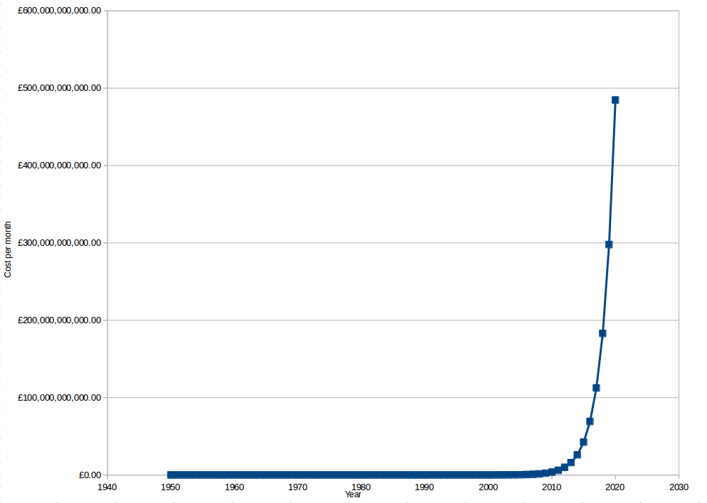 At £4.35/mo for 37,000 MIPS we get a cost of 12p per month per 1000 MIPS. We already have an estimate of how many MIPS were available in the entire world for any given year, so let's multiply that by 12p per month per 1000 MIPS to get an estimate of how much it would cost today to rent those MIPS.