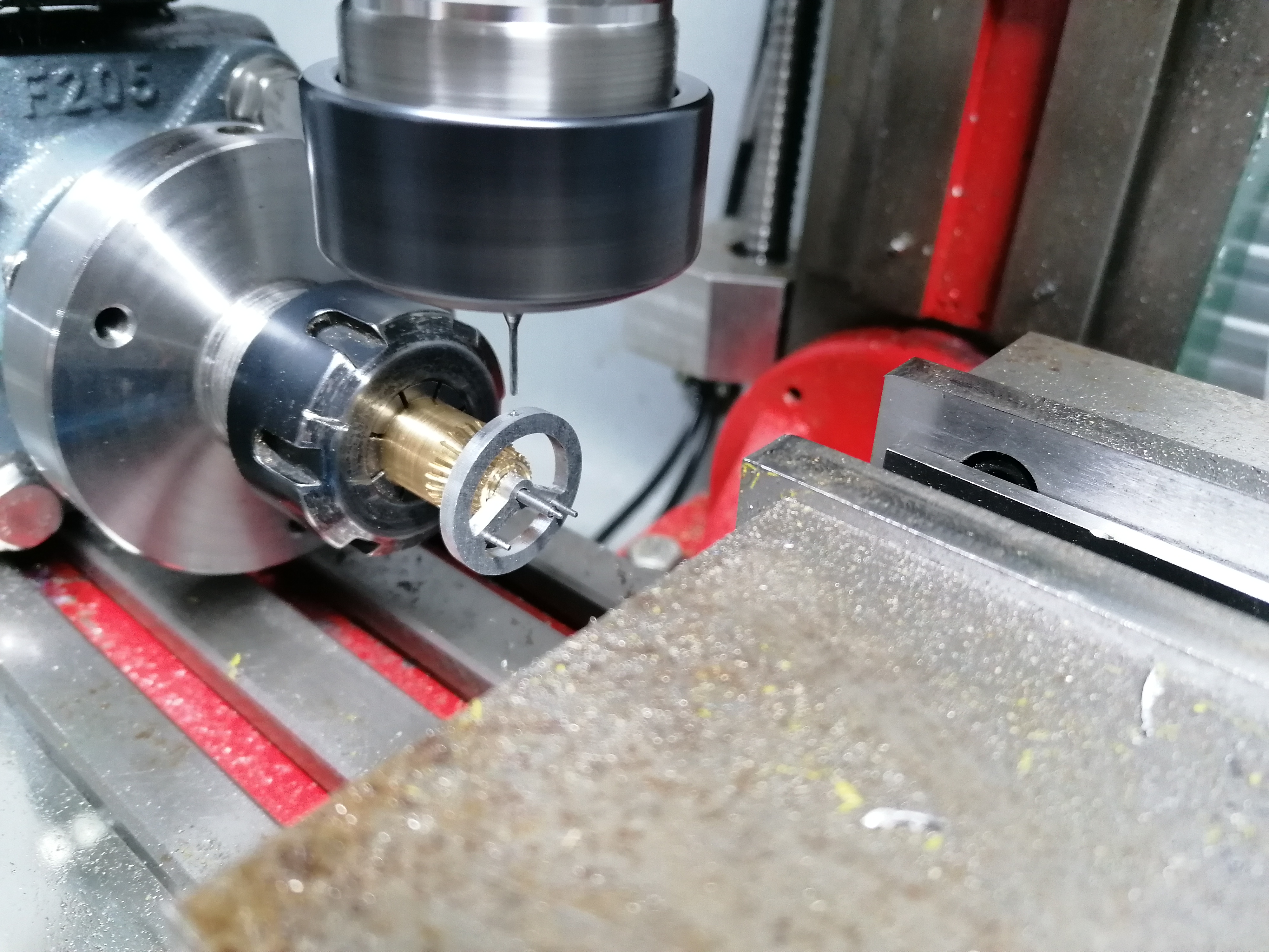 The plan is to make a fixture to mount the metal balance wheel on the 4th axis, and then drill holes around the perimeter to allow M1.6 screws to be added.