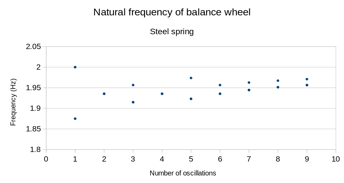 So if I repeat the experiment of letting it run 2 revolutions of the escape wheel with 2..14 nuts, how is our isochronicity now? Last time it ranged from about 2.050 to 2.225 Hz (+8.5%).
