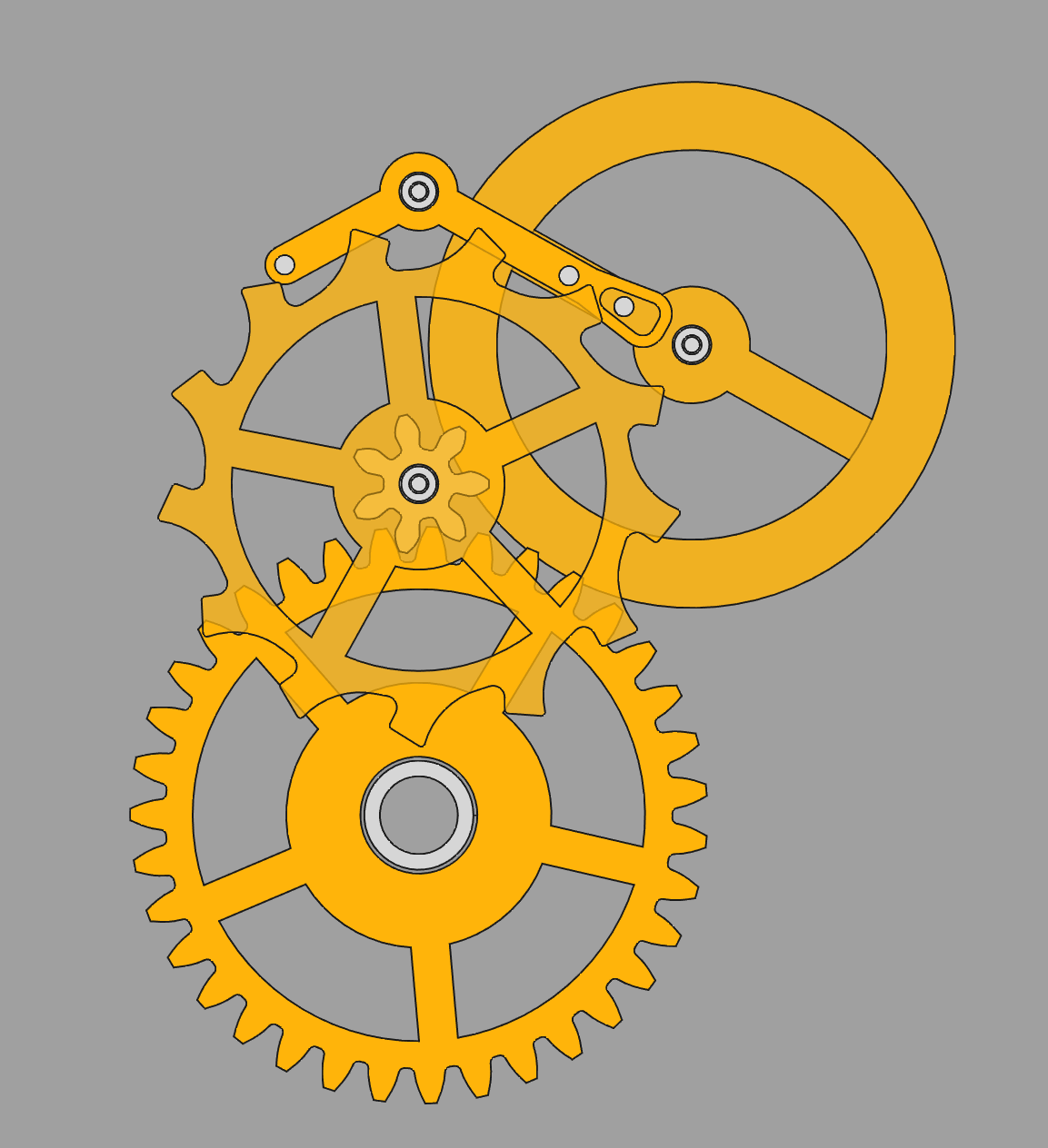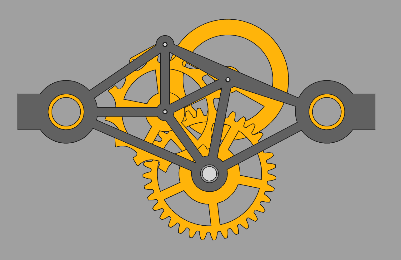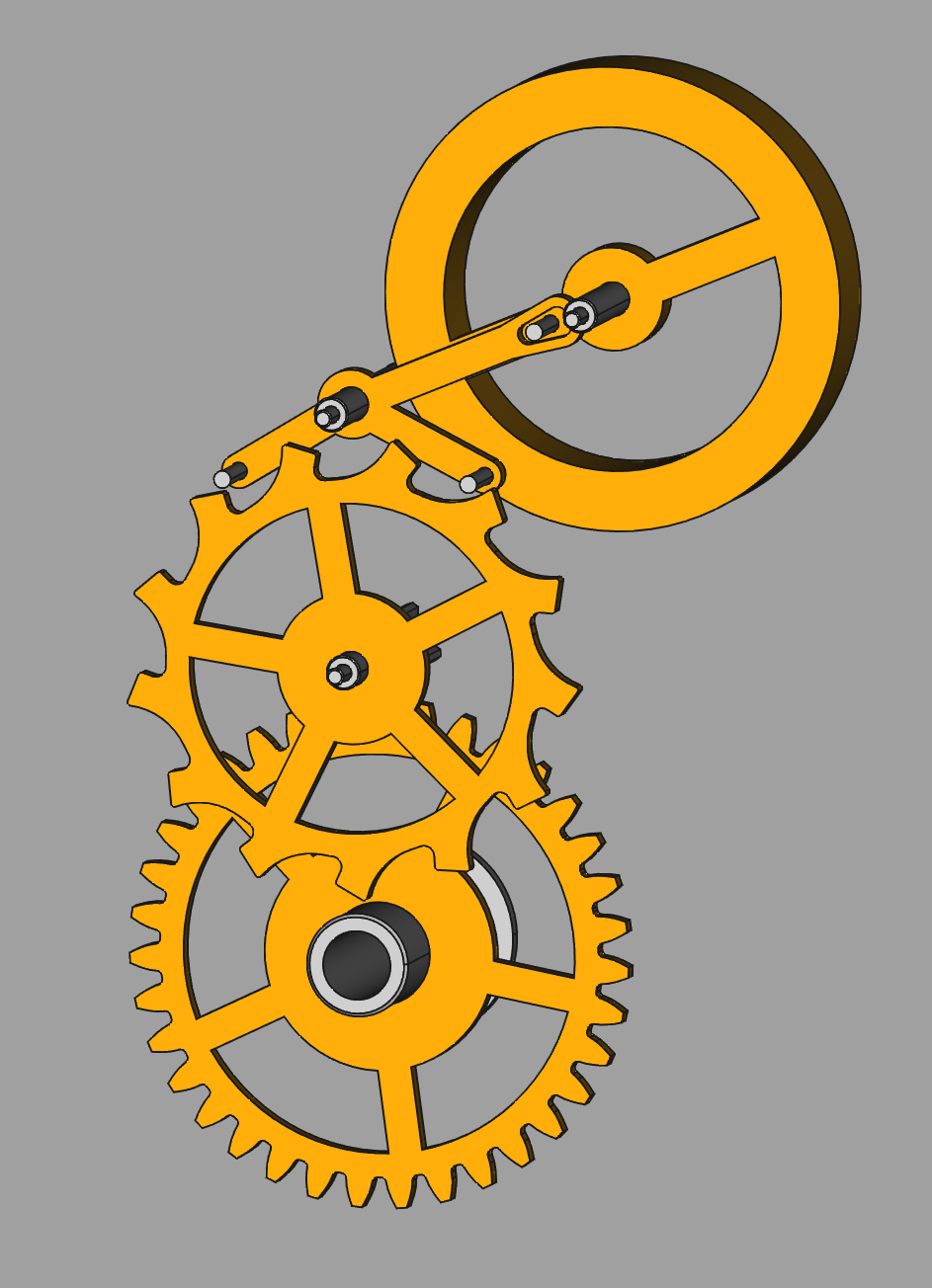 But I do like the simplicity of only having 2 arms on the "pallet fork", and it is much more compact than the first layout above, despite being totally equivalent. So maybe I just need to make that pinion a bit shorter.