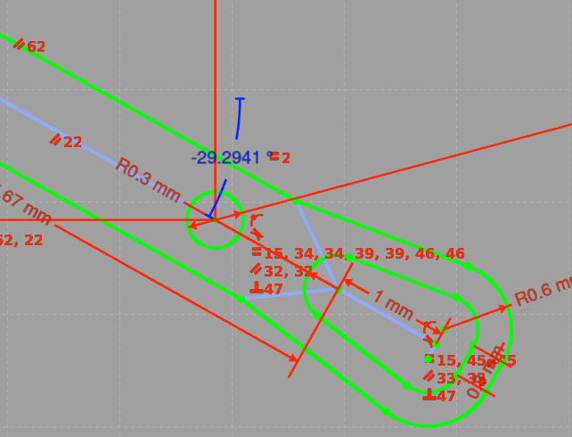 I'd like to try putting the "lever" arm inline with the discharging pallet arm, just seems elegant that way. Let's have a look at that. It's at 29.2941 degrees from horizontal (blue dimension):