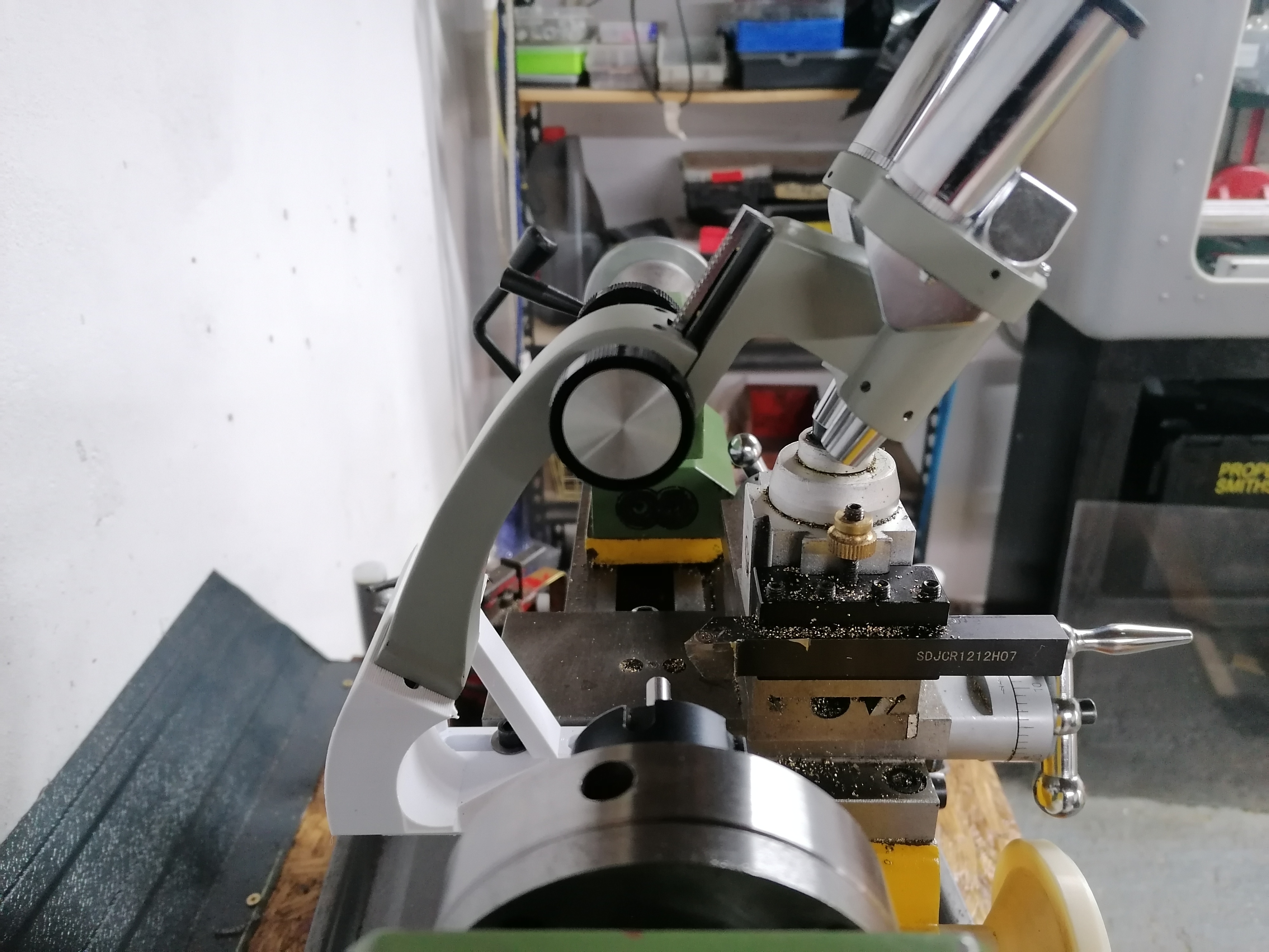 The focal point is still at the limit of travel, and even at the limit of the slots it can't point at the centre line of the lathe. With the tip of the tool in the centre of the frame it is 10mm away from centre line.
