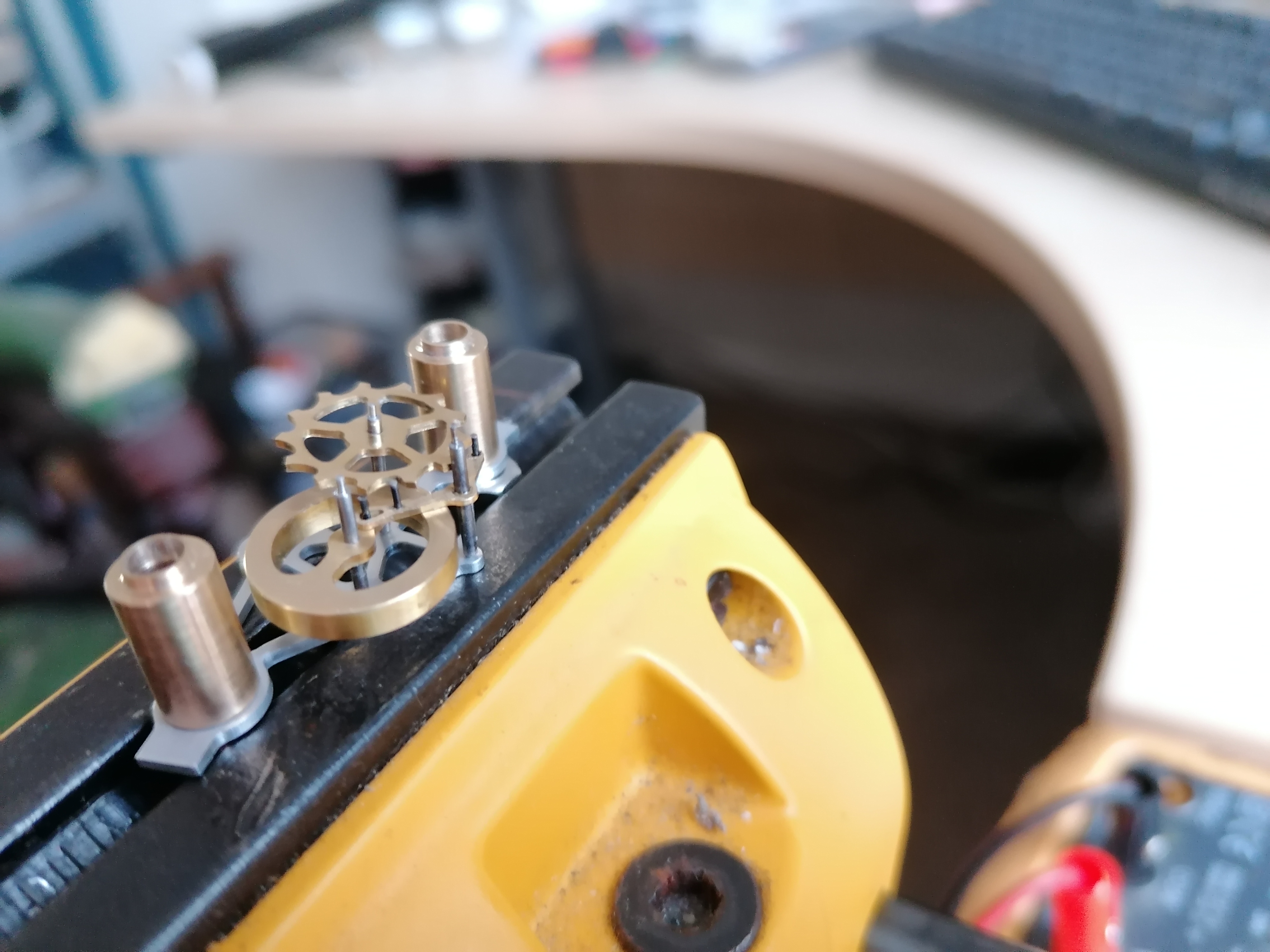 Remedy: Make a shorter shaft. Turn the escape wheel down to 0.5mm thickness.