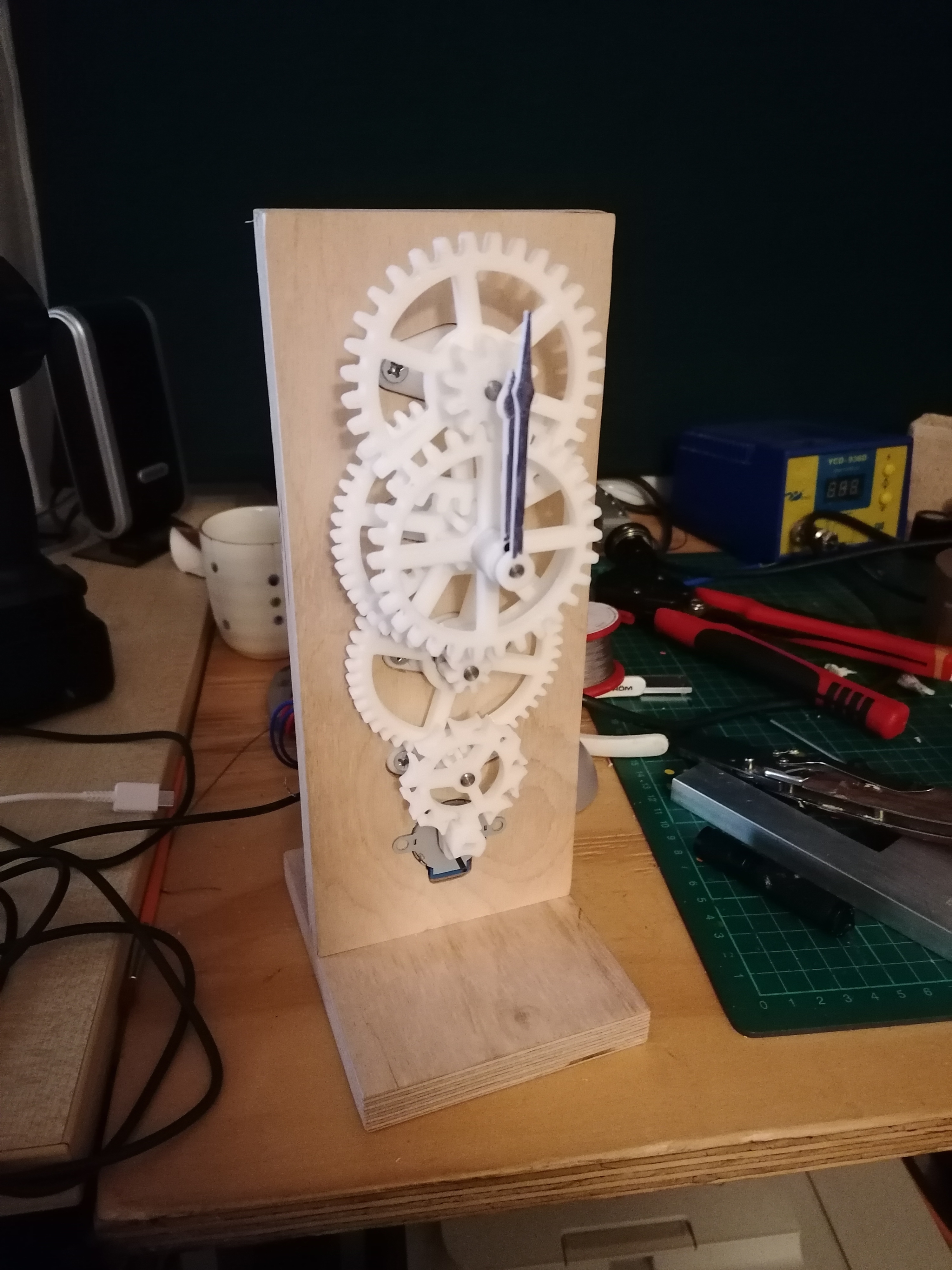 The magnetic slip fitting to allow the setting of the hands seems to have tight spots, which makes setting the hands very difficult. Also there is some play in the minute hand because I accidentally cut the flat on the shaft too deep. So setting the time by moving the minute hand is inadvisable, instead it is better to rotate the gear that drives the minute hand, so maybe the plan is I should make some sort of fitting that allows turning that gear with a key. So much for not needing a key. Or maybe I just live with turning the gear by hand.