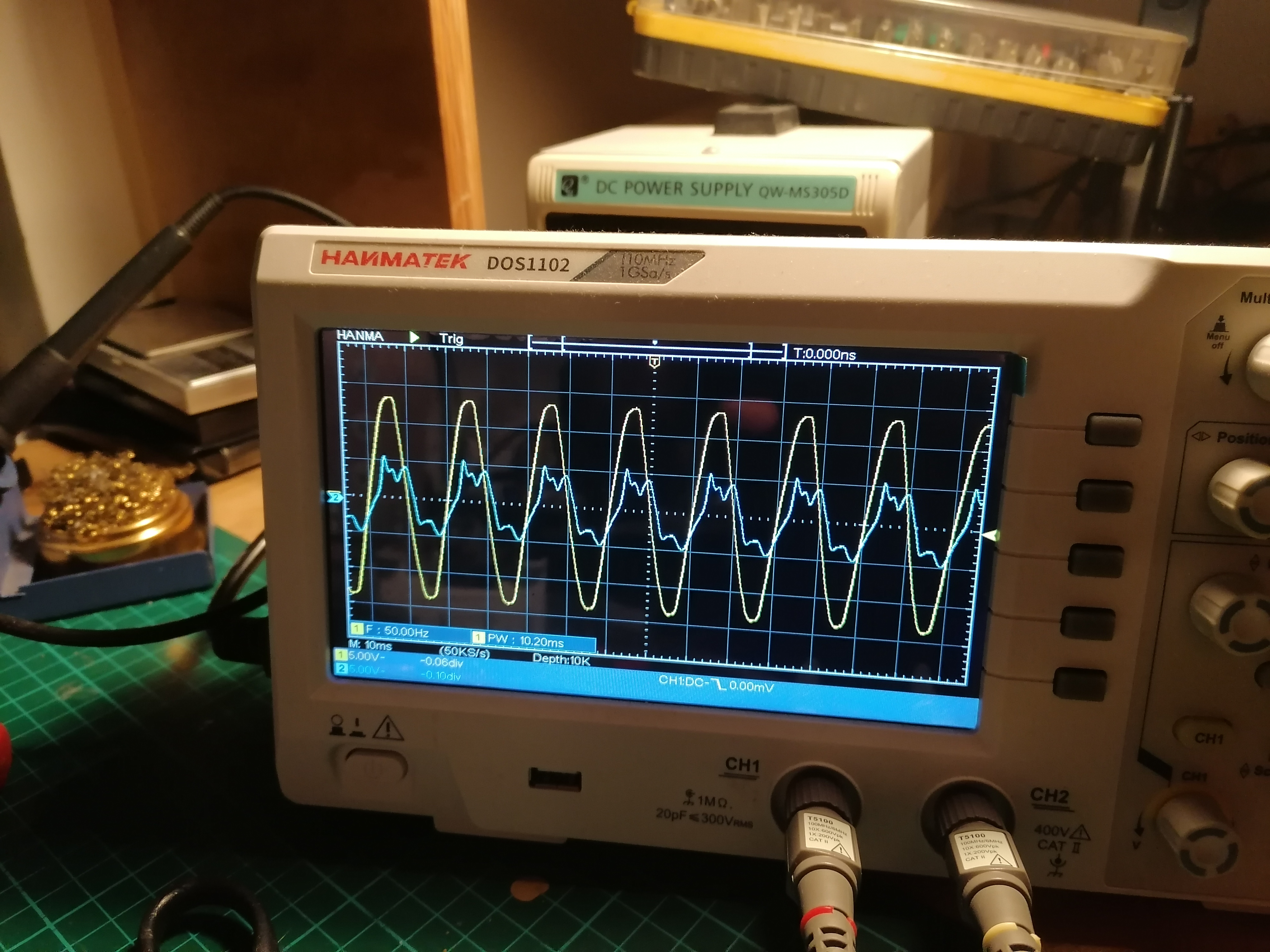 That's now at 5V/div on both channels. The motor just vibrates and does not turn. Obviously still too much capacitance.