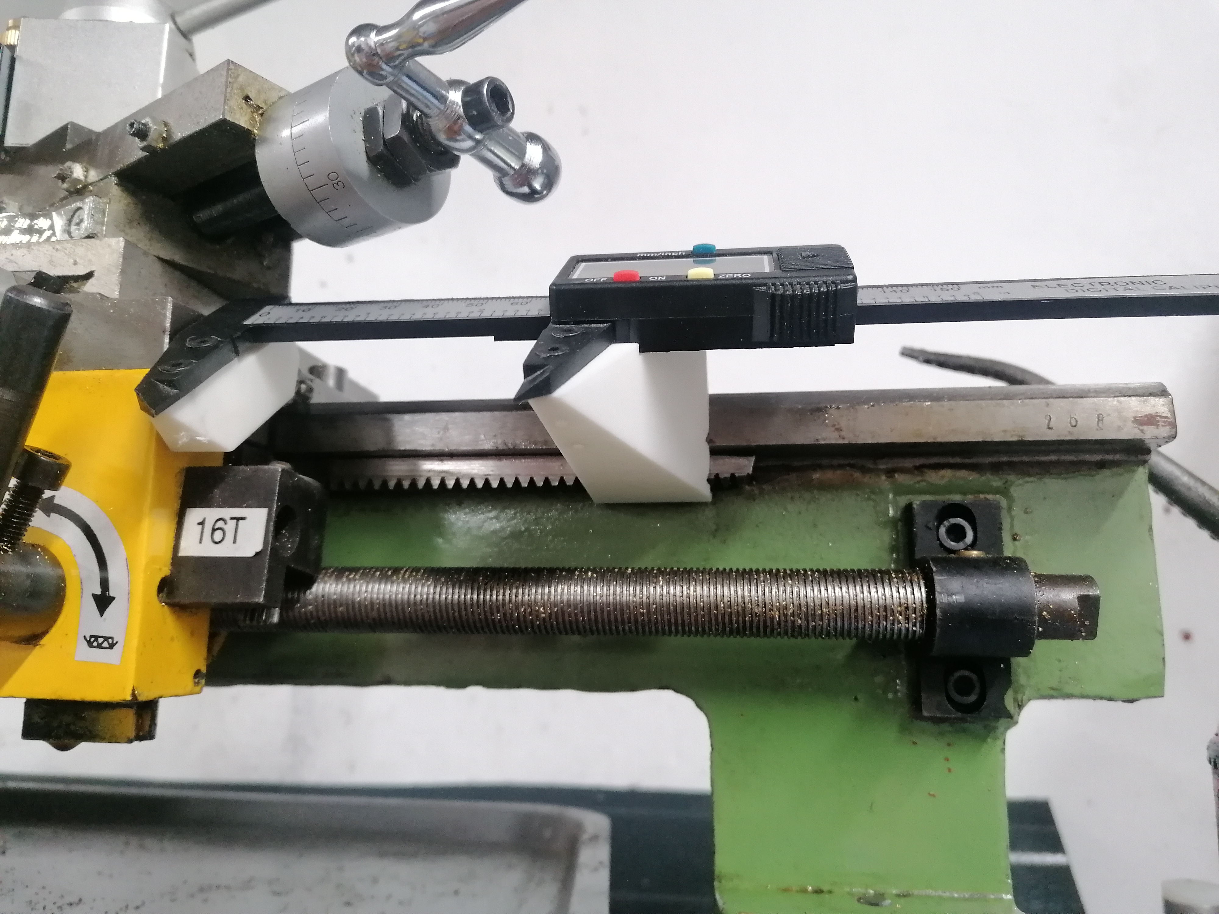 Great success! I used it to discover that 1 turn of the handwheel moves the carriage 3/4 of an inch.