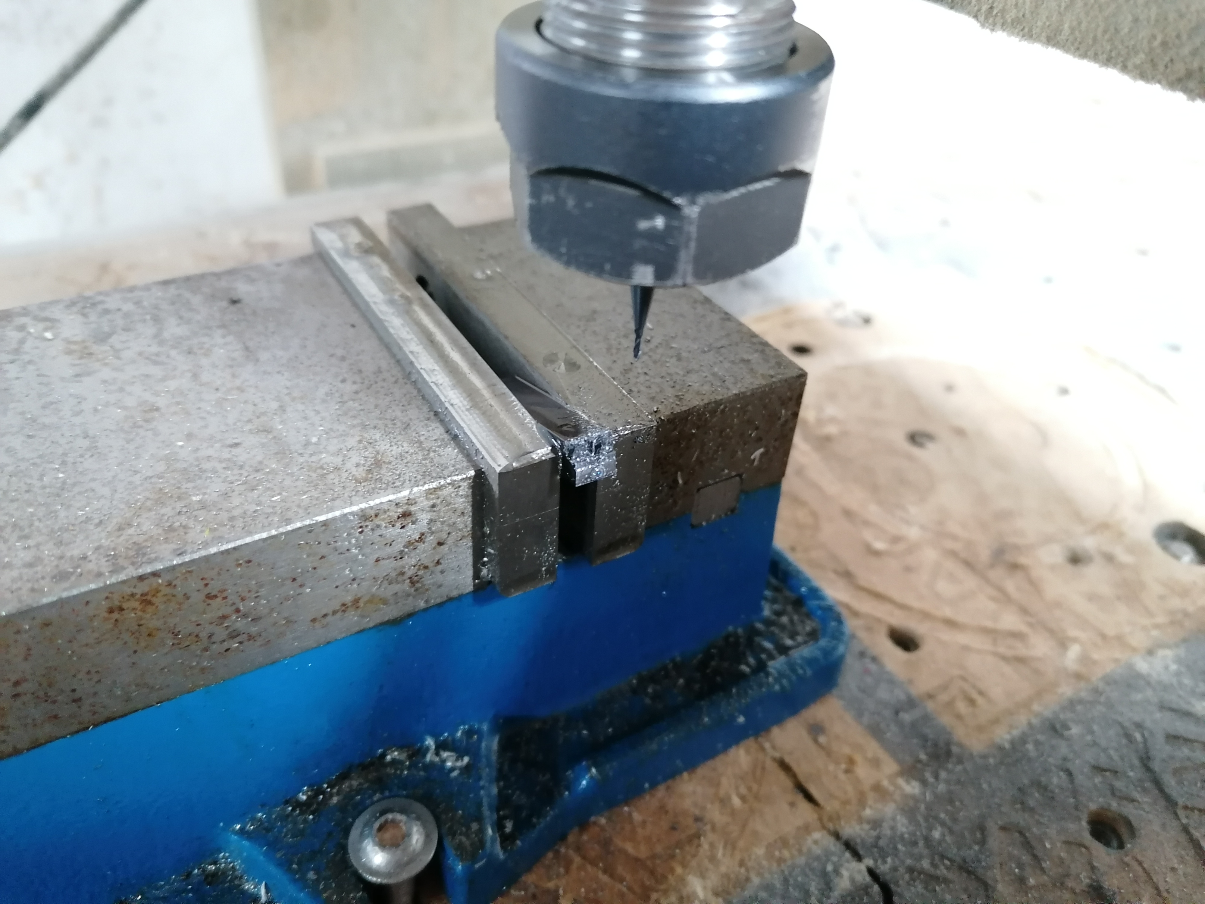 The 1mm end mill only has 3mm of flutes, so I hacked the bottom off with the grinder.