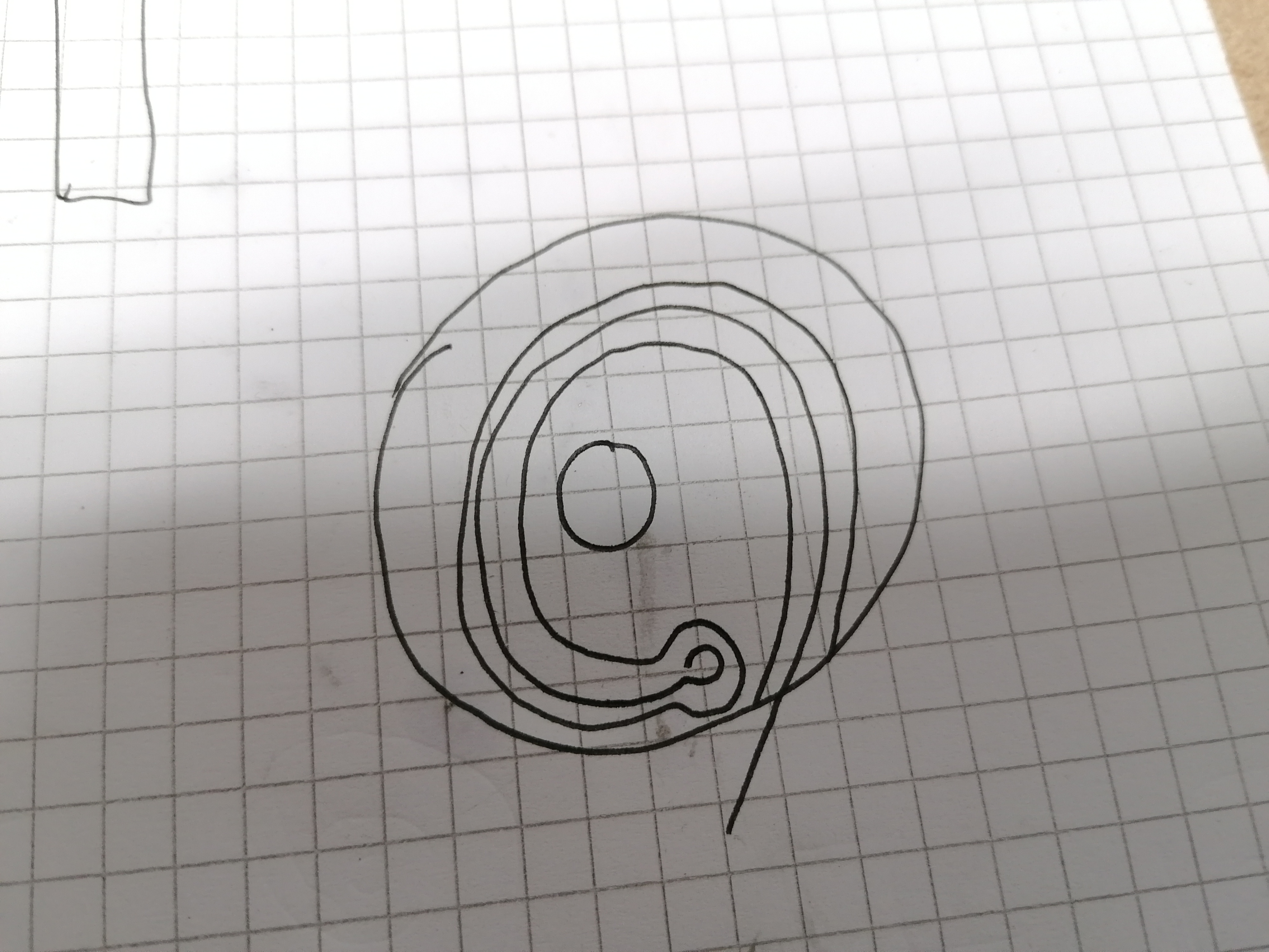 Maybe I make the hub very large, and have a complete coil inside the hub, terminated with a larger area with the wire looped back on itself, like this: