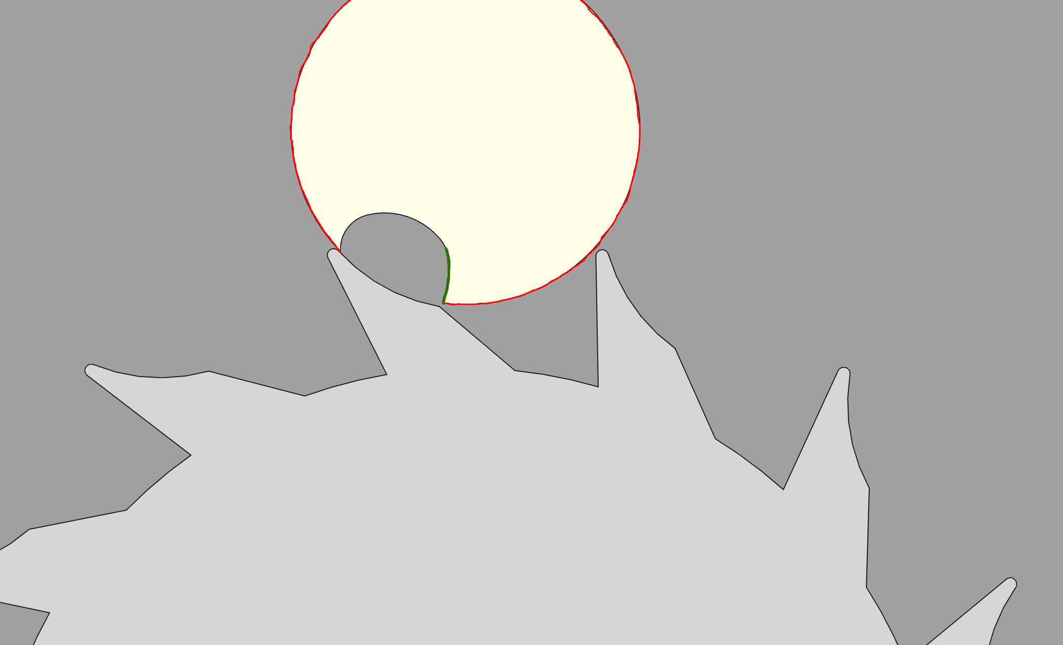Happily, this can all be machined with a 1mm tool. We don't actually care about the shape of the curve though, as it is mostly clearance. I've marked in red the resting surface and in green the impulse surface: