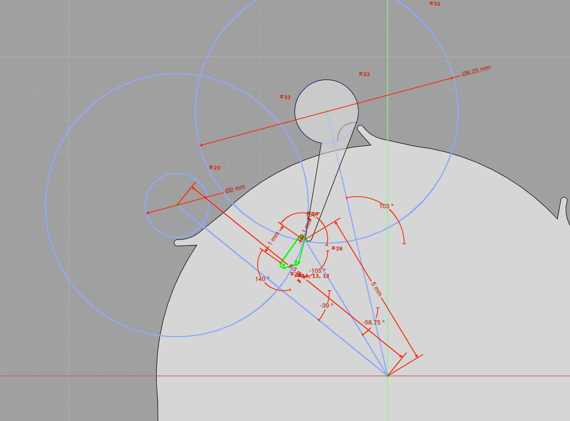 Now to get 45 degrees impulse angle, we need to make sure that the impulse pallet is radial to the roller, and when the roller is at +32 degrees (escaping angle, plus drop to impulse) then the impulse pallet is at -22.5 degrees from the line of centres between the two wheels, and that at this position the impulse tooth is just touching it, while the locking tooth has just left the roller.