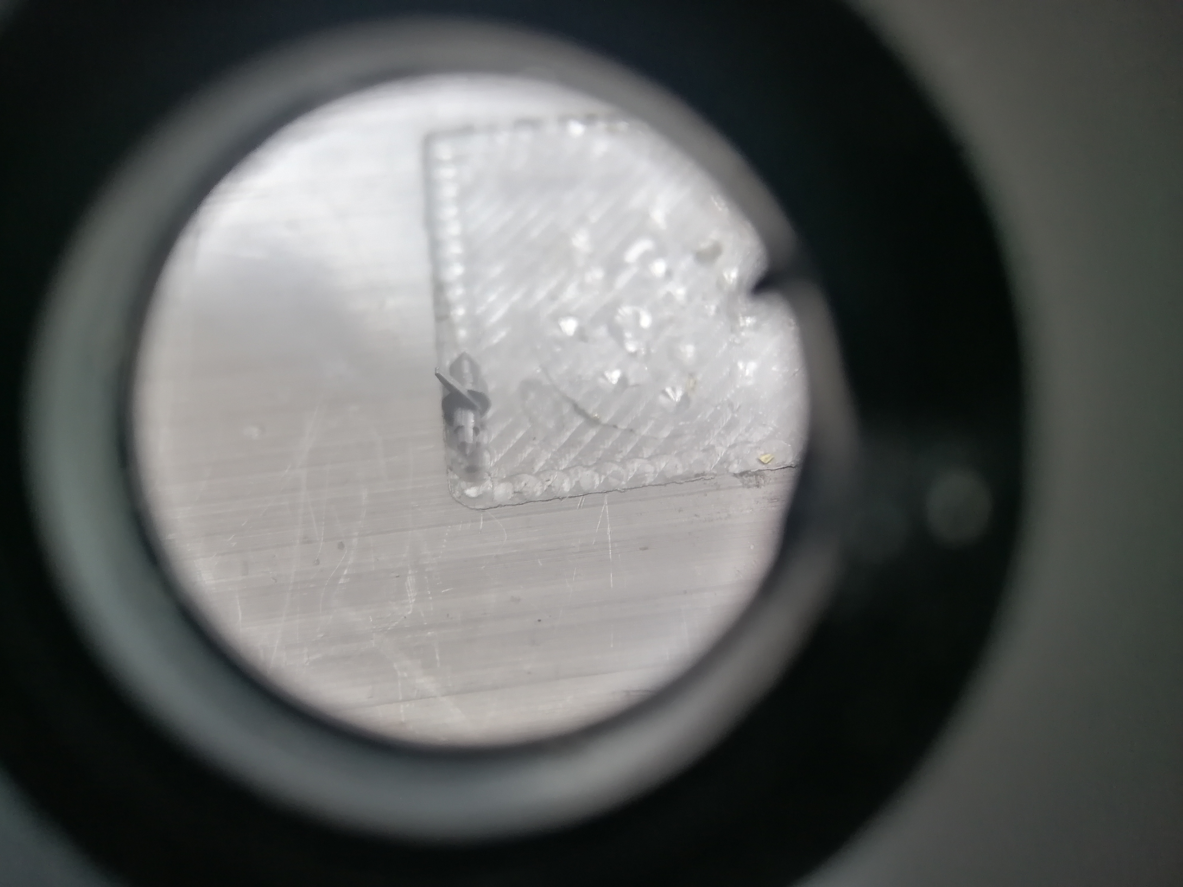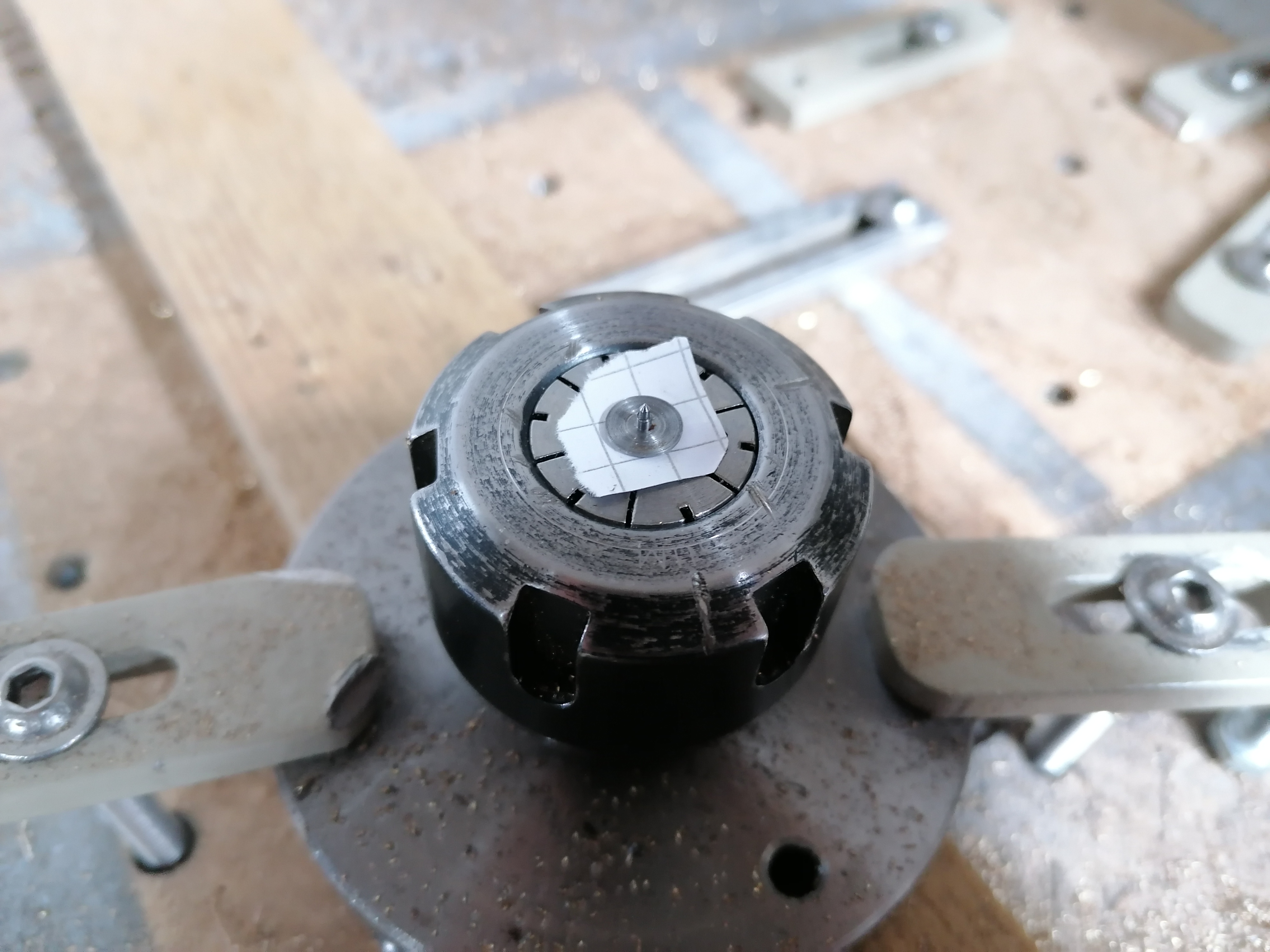 I've depened the lower cone pivot slightly, using the chamfer tool by hand, not sure I've done any good though. It seems to not be sharp enough for this application, the flat on the end of the tool is about 0.6mm across, which means my 0.3mm centre is effectively drilled in a flat surface instead of a cone!
