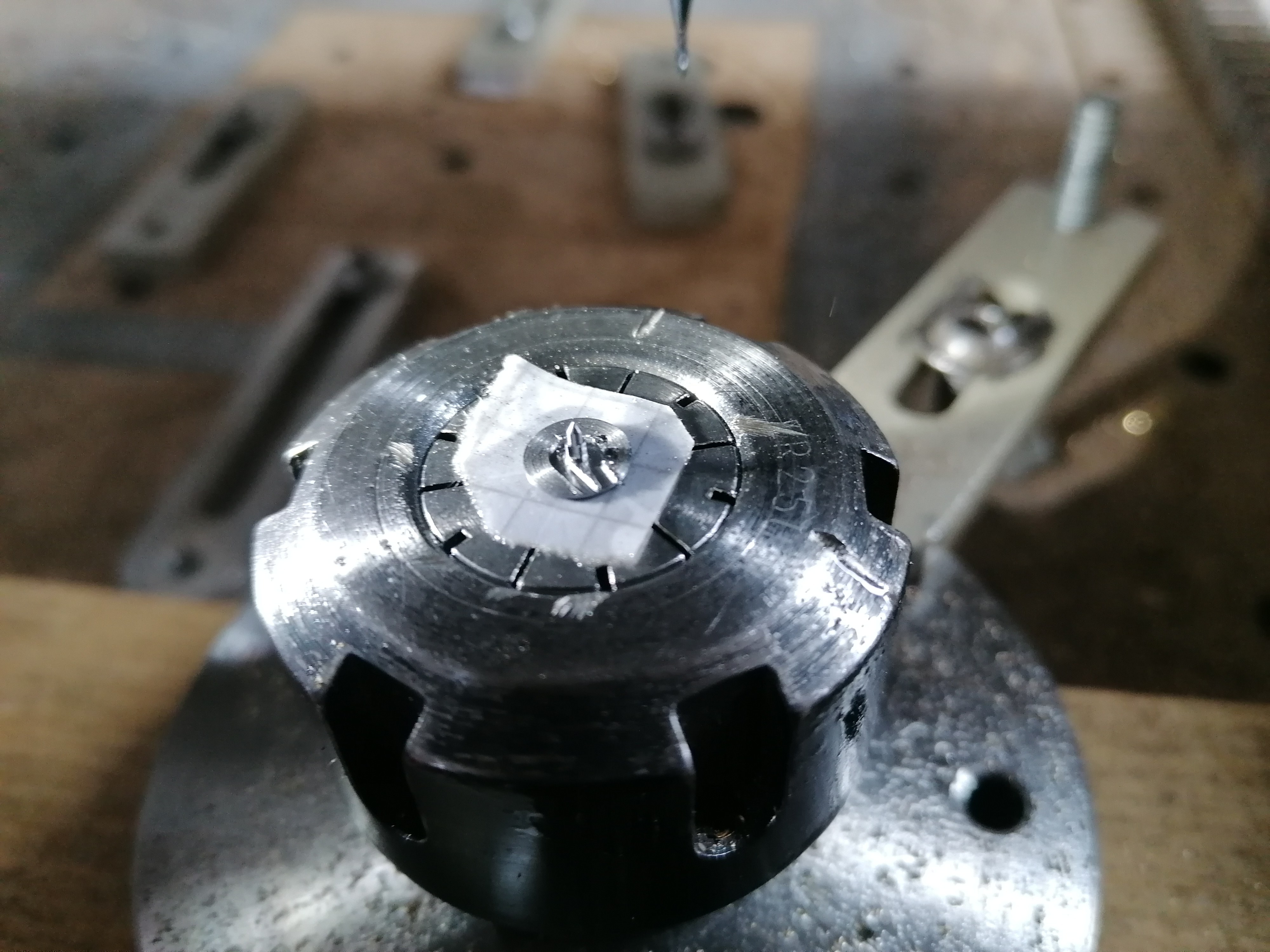 But it still looks like the hairspring collet is bearing against the flat surface, instead of the point bearing in the cone. And the slot in the screw is bad because I cut it with the angle grinder. And obviously the screw is still way too long.